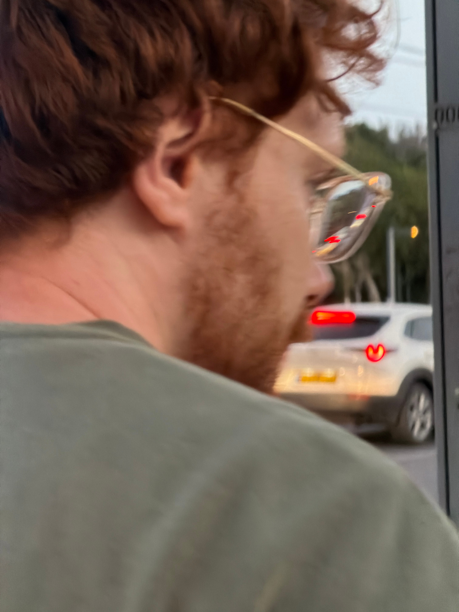 A close-up, rotated image shows a man with reddish-brown hair and a beard, wearing glasses. He is positioned near a window of what appears to be a vehicle, judging by the blurred exterior view through…read more