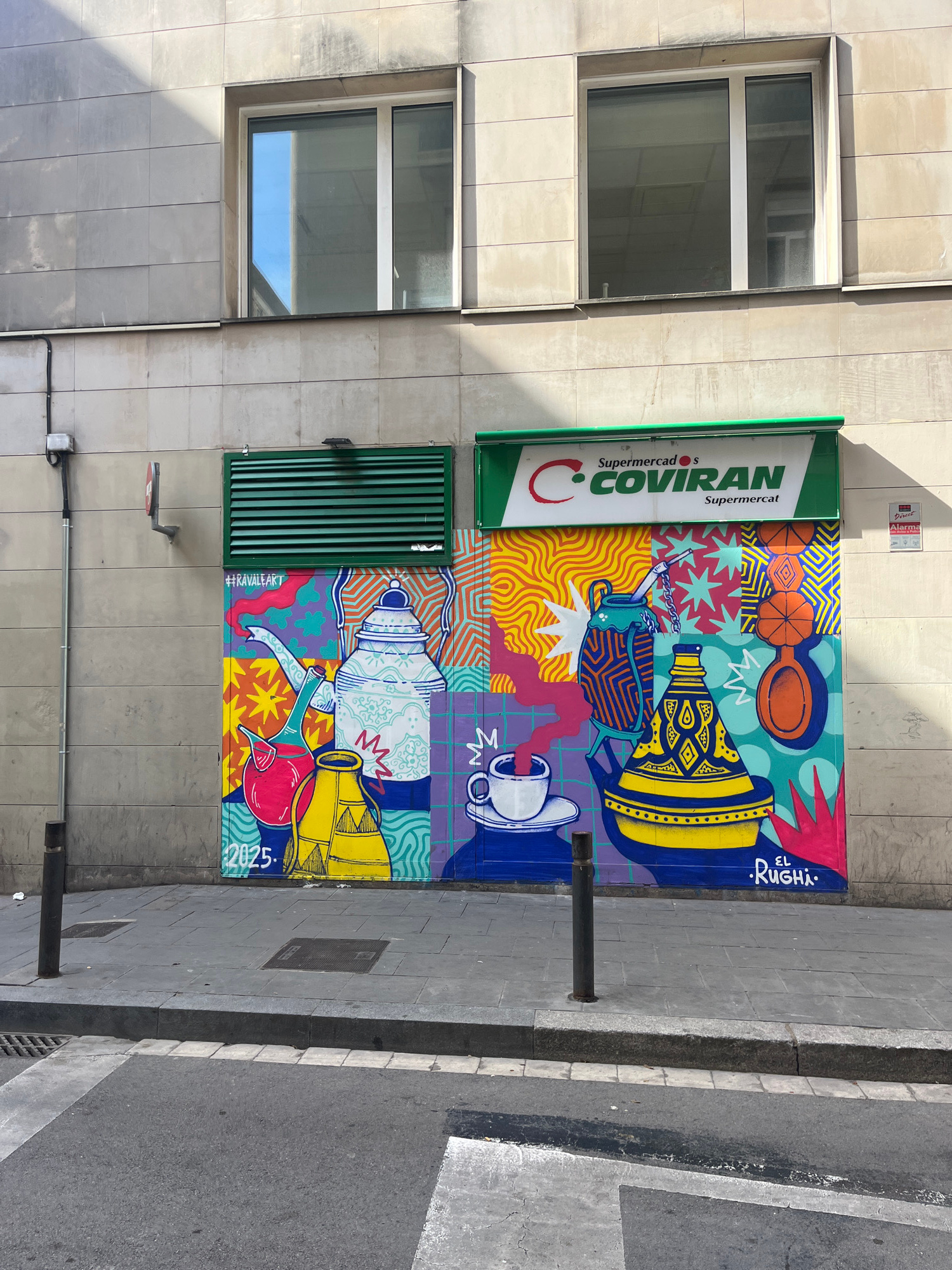 The media file is a vertically oriented, eye-level shot of a building facade adorned with vibrant street art, a supermarket sign, and elements of a city street and sidewalk. The scene is brightly lit…read more