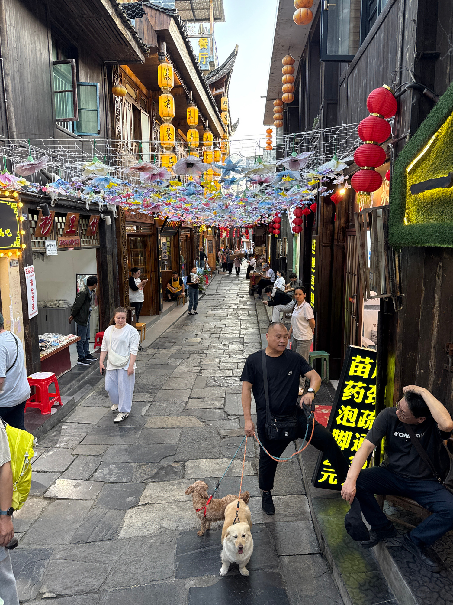 The image shows a narrow, paved street in Furong, China, lined with traditional wooden buildings adorned with hanging yellow and red lanterns. A mesh structure above the street is decorated with color…read more