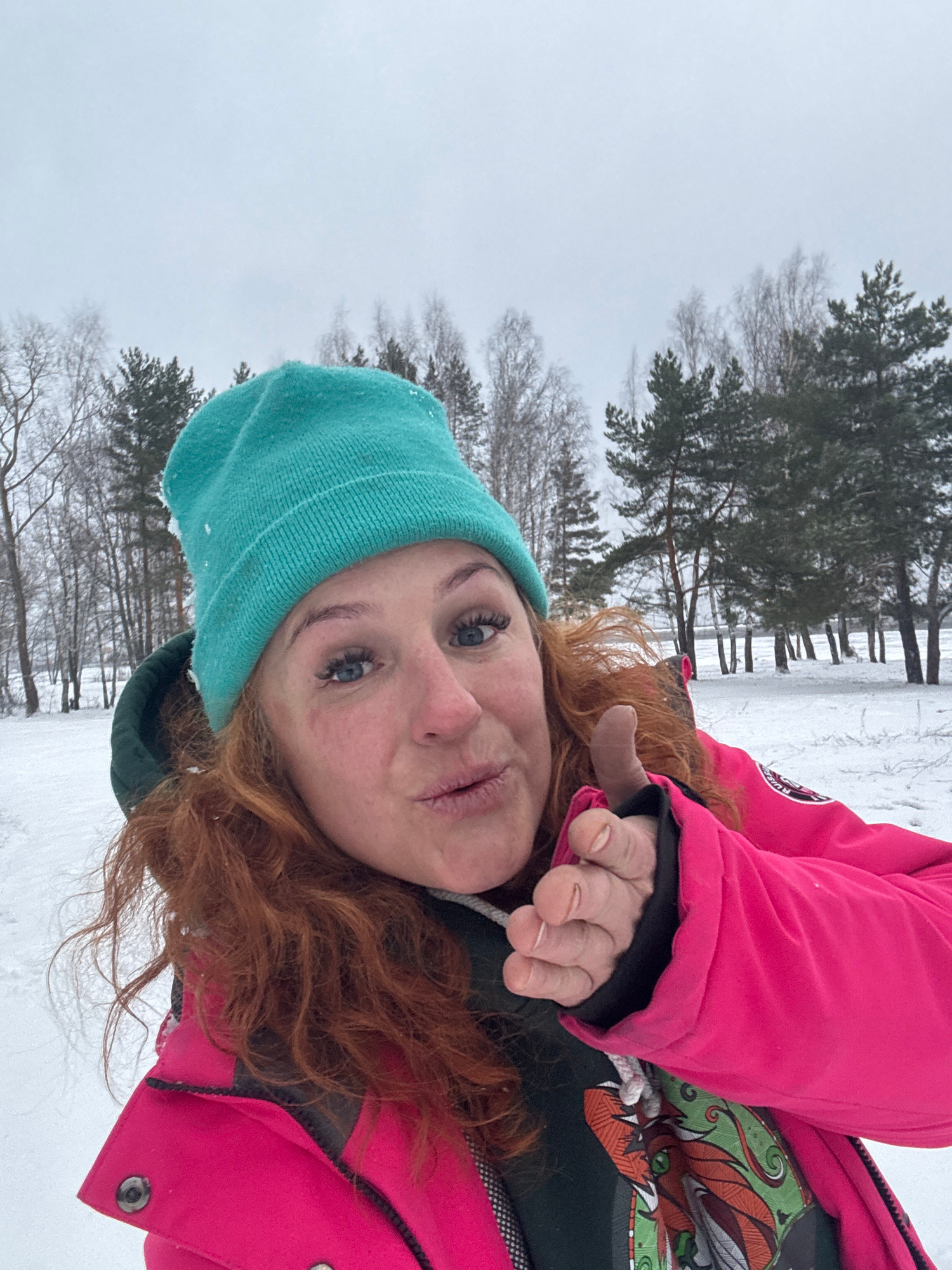 A selfie shows a woman with red hair wearing a turquoise beanie and a bright pink winter coat. She is pouting slightly at the camera and holding up her hand. The background is a snowy landscape with a…read more