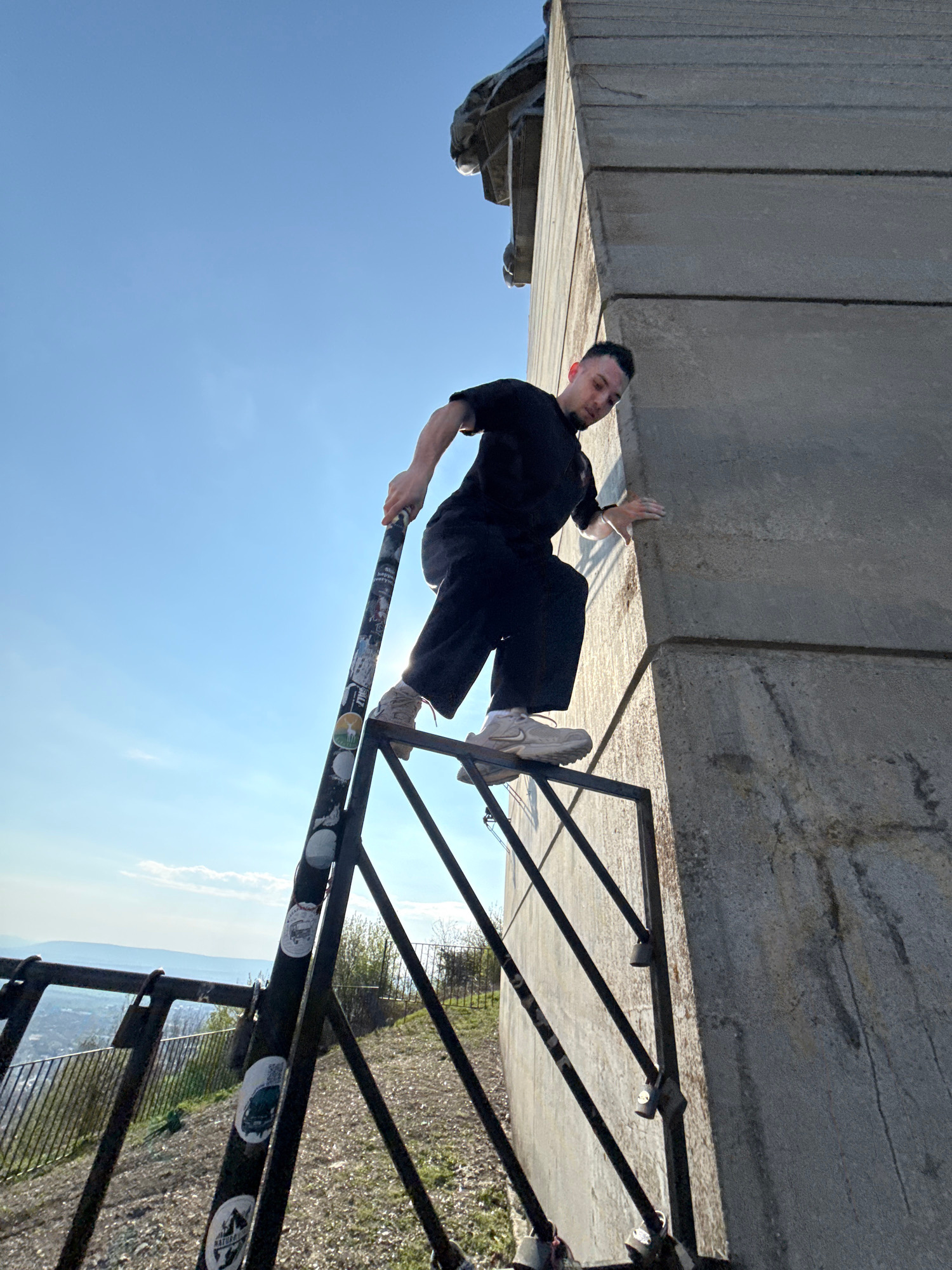 A person in dark clothing and light-colored sneakers is hanging upside down from a black metal railing affixed to a light gray concrete structure. The railing is covered with stickers. The person is g…read more