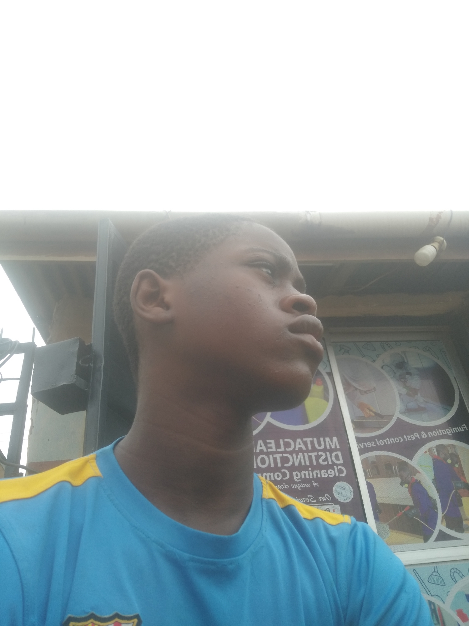 A young person with dark skin and short hair is looking upwards. They are wearing a light blue t-shirt with yellow accents. Behind them are signs for a cleaning and pest control company, indicating th…read more
