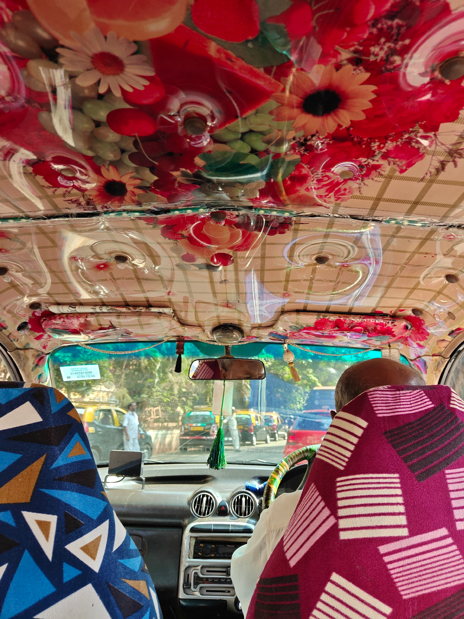From inside a taxi in Mumbai, India, the photo shows a driver wearing a pink and white patterned shawl over his shoulders. The dashboard includes a radio and air conditioning vents. The seats are cove…read more