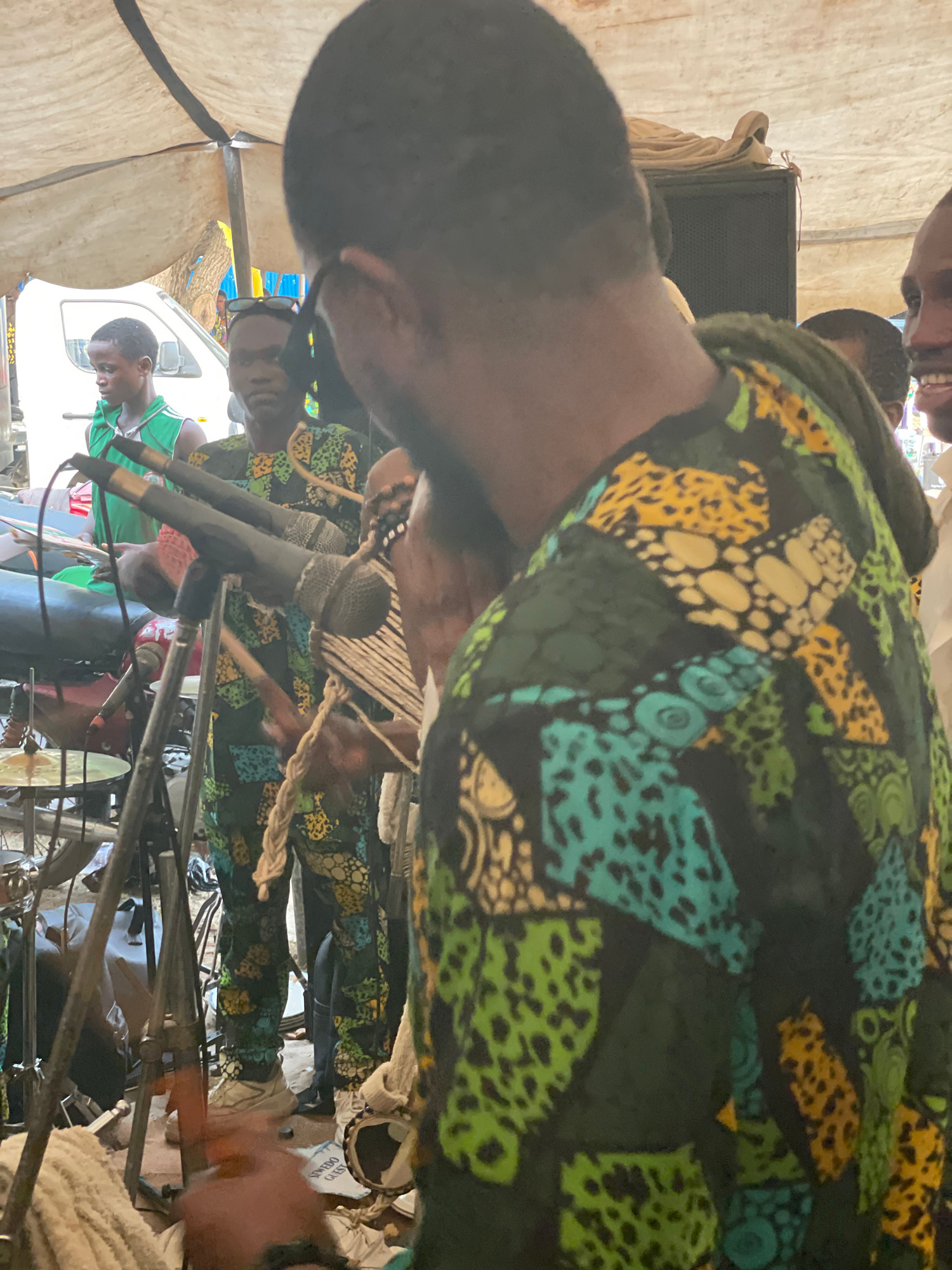 The image depicts a scene in Badagry, Nigeria, featuring a group of men dressed in patterned clothing. Some are playing musical instruments; microphones are visible. They appear to be performing under…read more