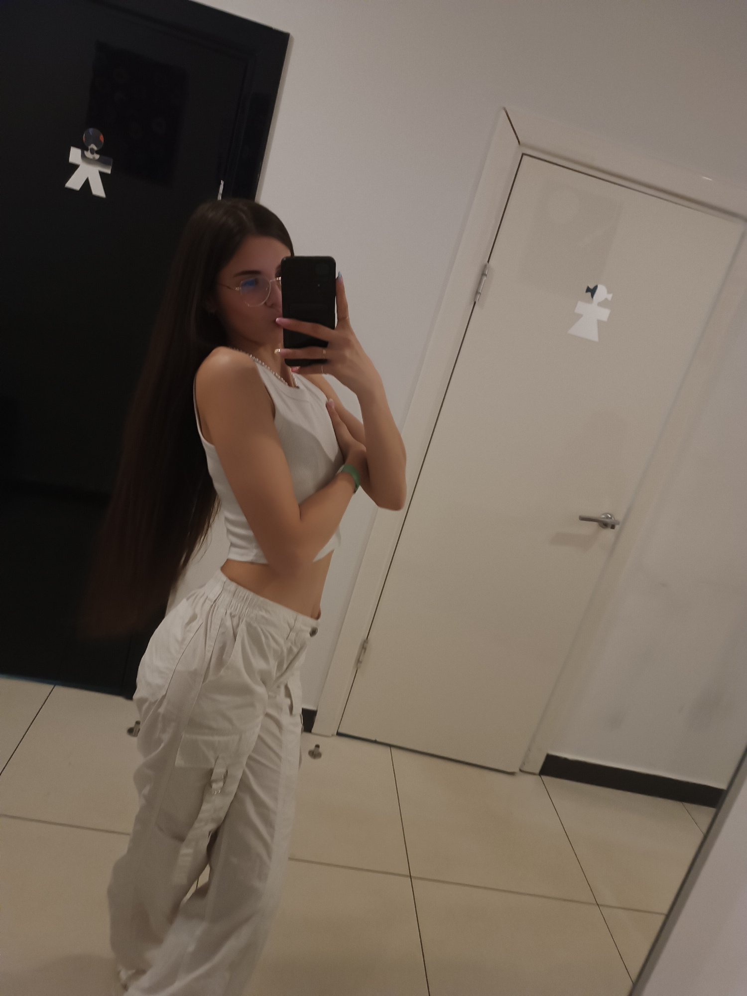 A young woman stands in a public restroom, likely in a commercial establishment, taking a mirror selfie. She is dressed in a white tank top and baggy white pants. She is holding her phone in her right…read more