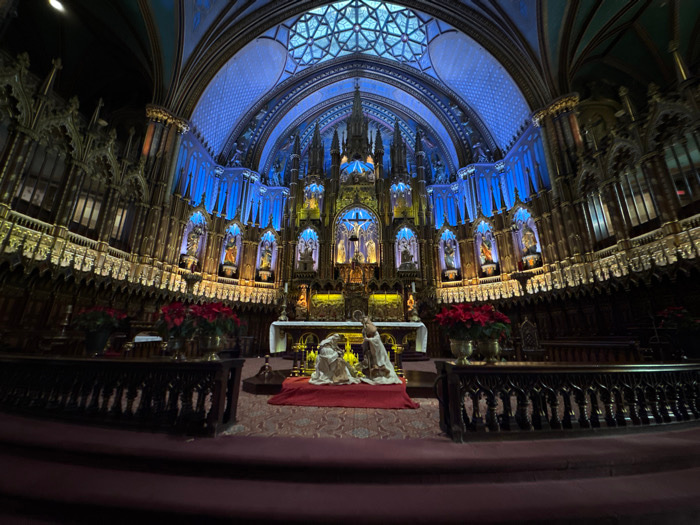 A grand church interior is depicted, dominated by an ornate, gold-accented altar featuring a crucifix and multiple statues. The altar is illuminated with blue and gold lighting, and a nativity scene iā¦read more