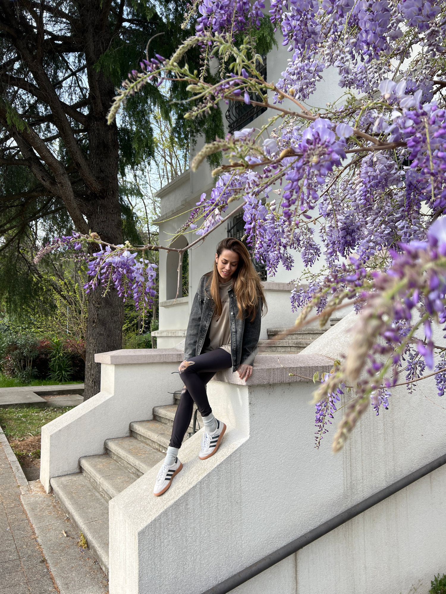 A young woman with long brown hair is sitting on the upper steps of a light-colored concrete staircase. She is wearing black leggings, a beige shirt, a black denim jacket, white socks, and white sneak…read more