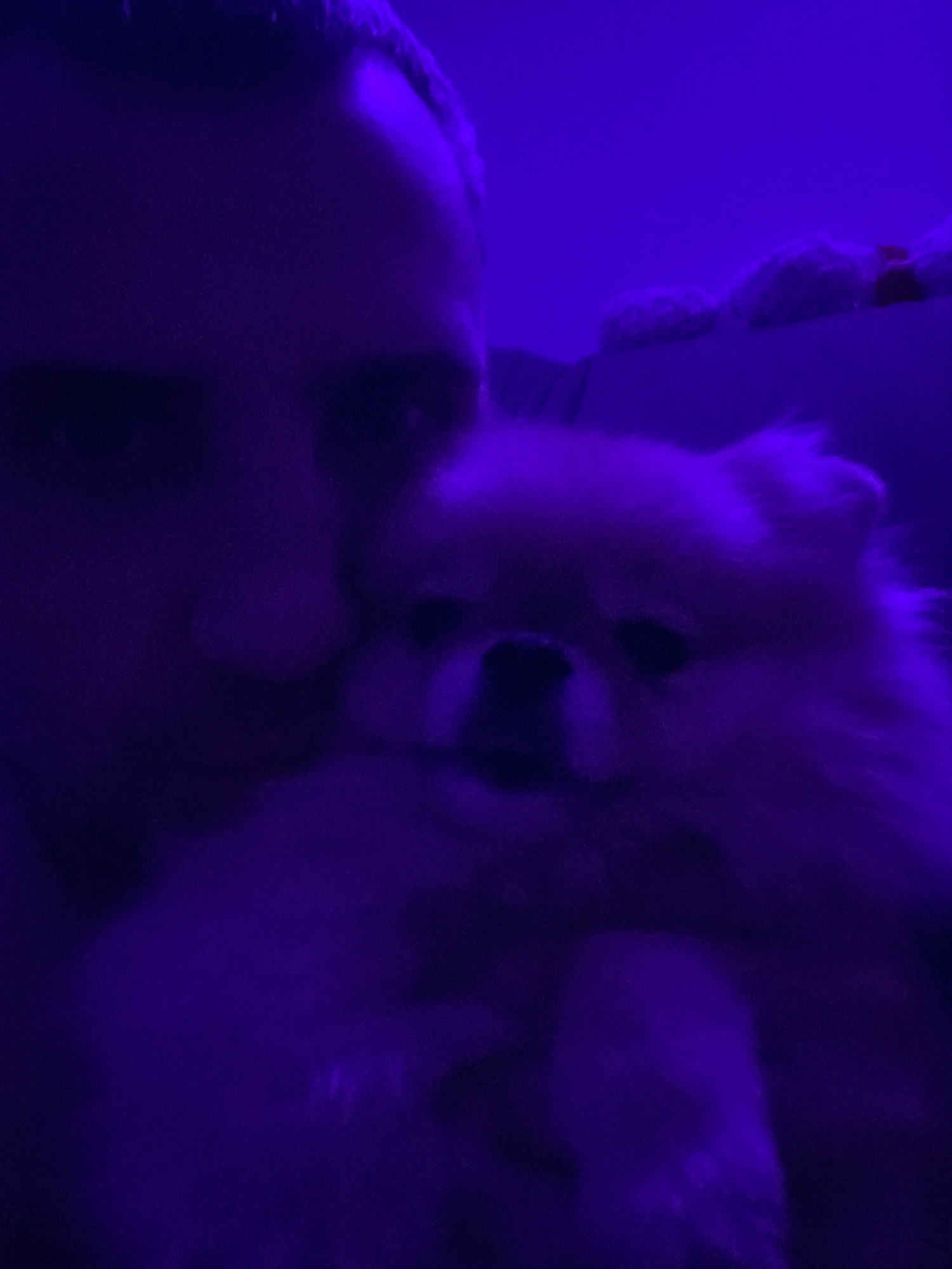 The image depicts two fuzzy animals under blue lighting. The animals are likely dogs of a small breed with light-colored fur. One of the dogs is facing forward with its mouth open. The other dog is po…read more