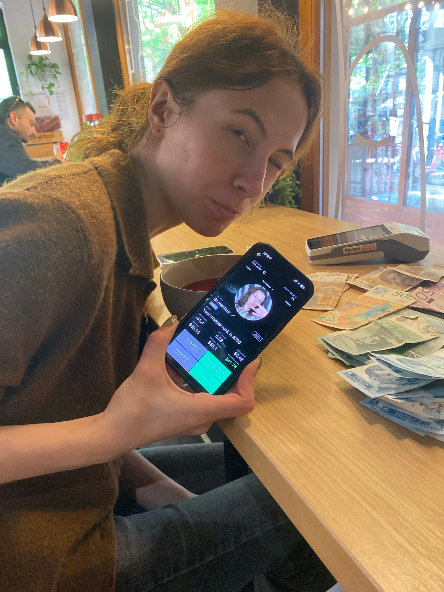 A young woman is seated at a light-colored wooden table indoors, holding a black smartphone displaying what appears to be a cryptocurrency-related application. The app interface shows account informat…read more