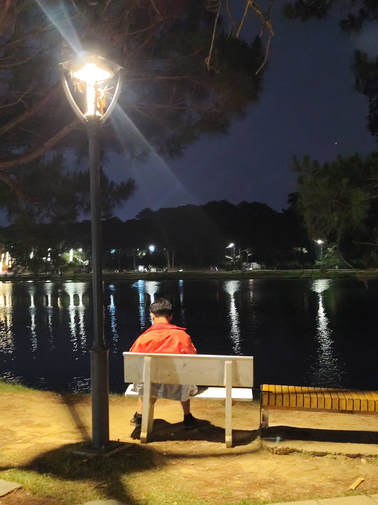 A person wearing a red jacket sits on a white bench next to a lamppost, facing a body of water at night. Reflections of lights shimmer on the water's surface. The backdrop features silhouettes of tree…read more