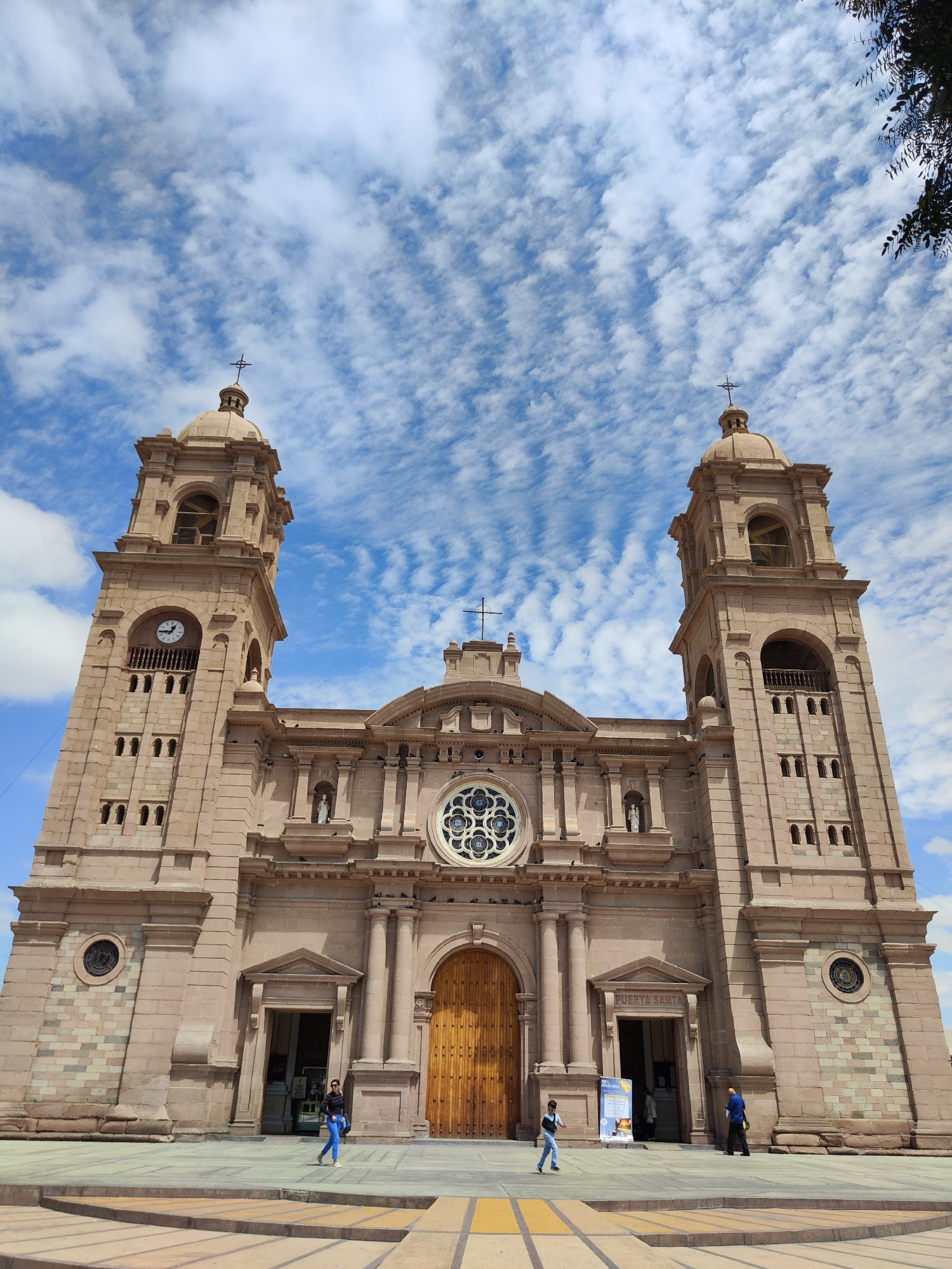 The image captures the Tacna Cathedral in Tacna, Peru. The cathedral is a large, pale-stone structure with two prominent towers, each topped with a dome and cross. A large rose window is centered abov…read more