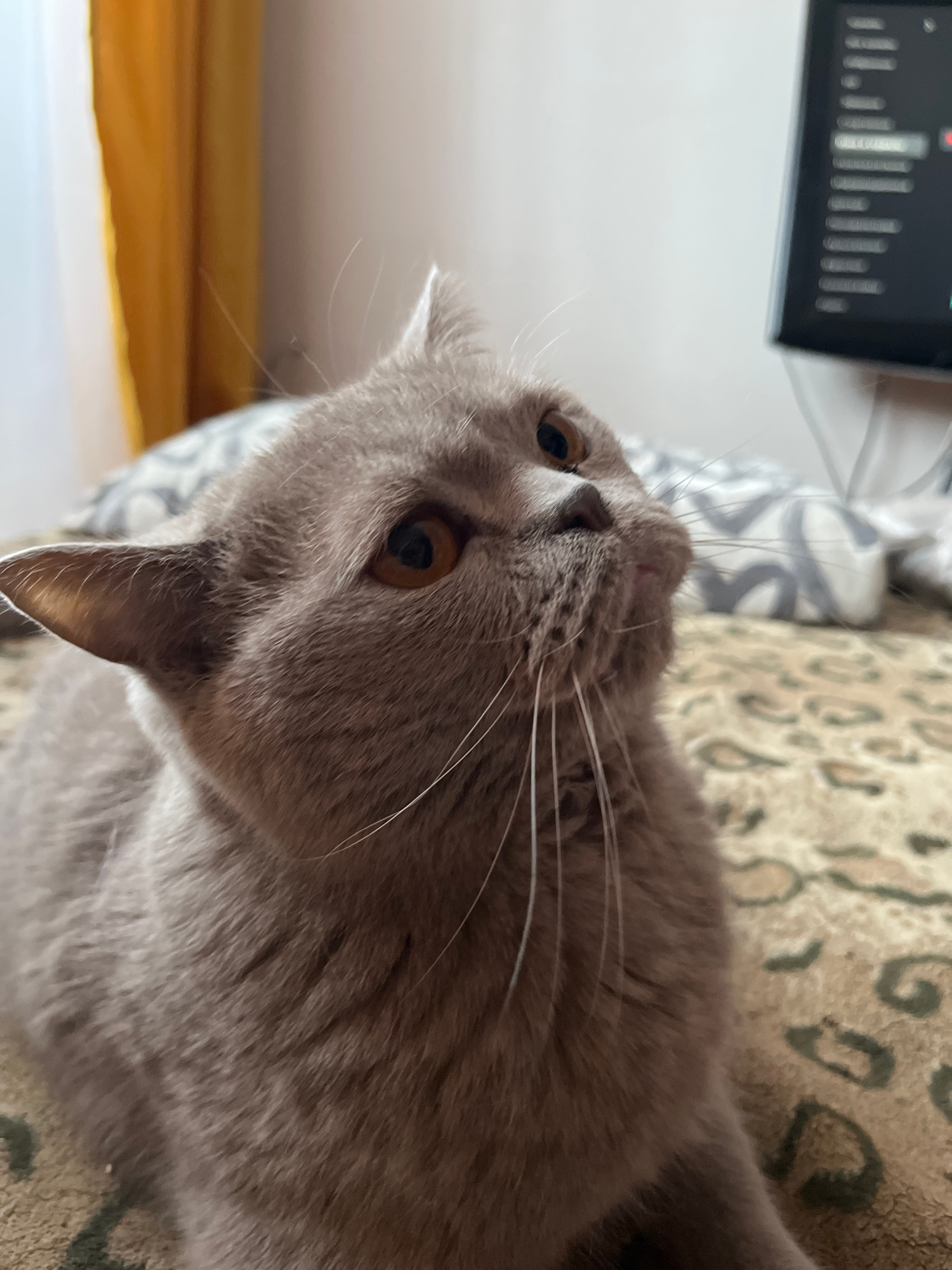 The image captures a close-up of a light grey, short-haired cat, possibly a British Shorthair, with prominent amber-colored eyes and long white whiskers. The cat's head is featured prominently in theβ¦read more