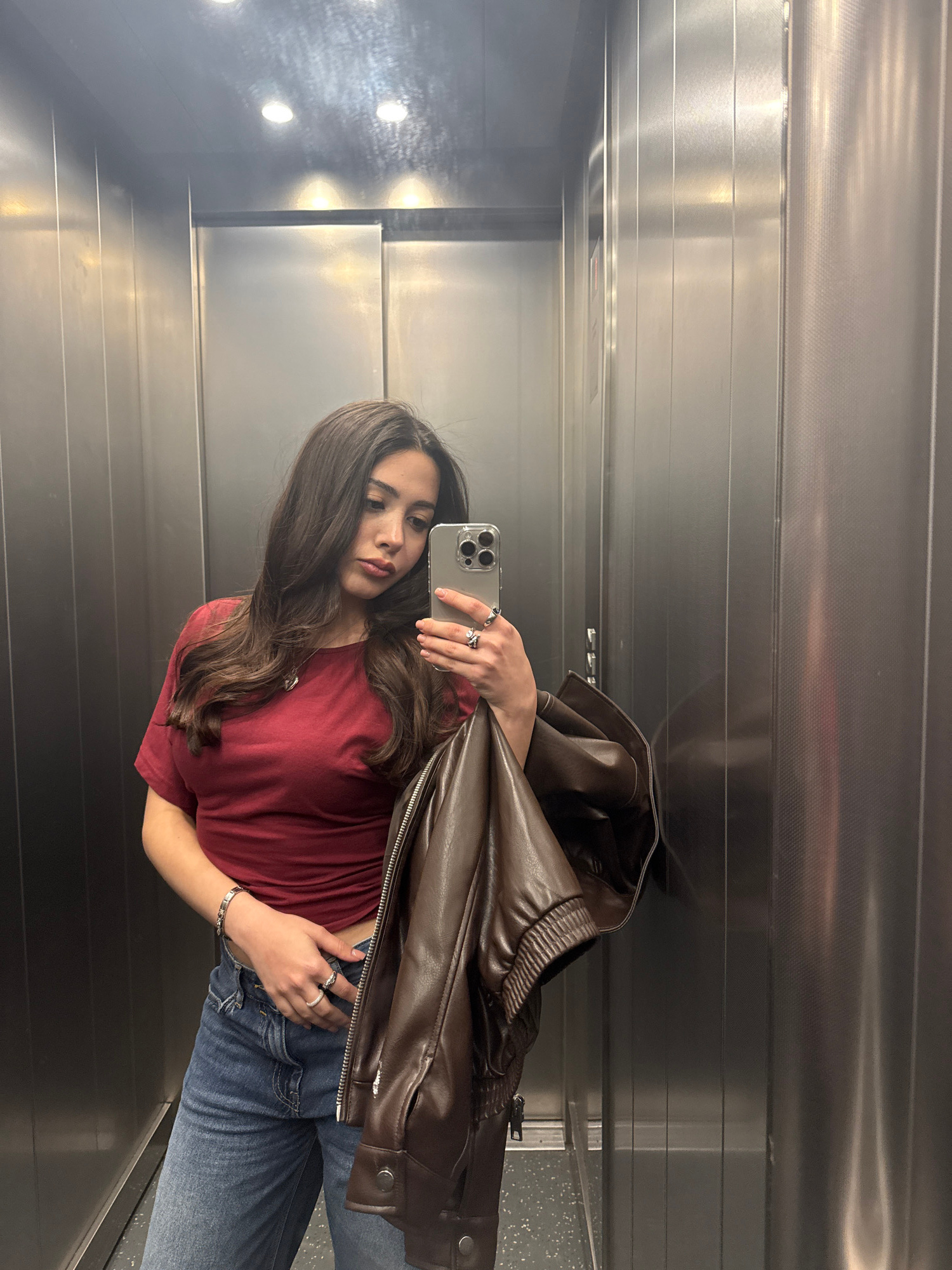 A young woman is taking a selfie in an elevator with reflective stainless steel panels. She is wearing a red t-shirt, blue jeans, and a silver bracelet, and is holding a brown leather jacket. The city…read more
