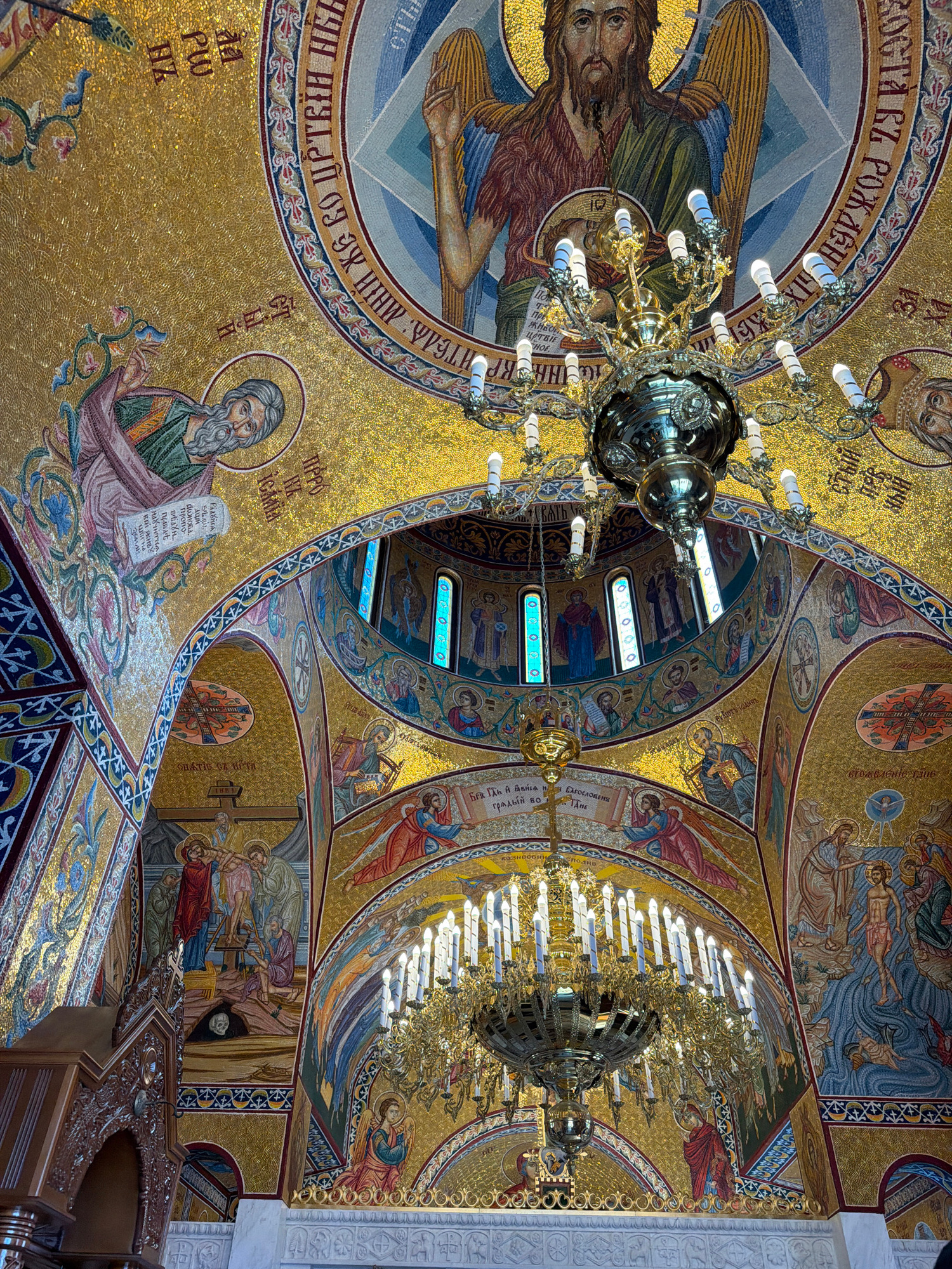 The image captures a view of the ornate, mosaic-covered ceiling of a church, likely located in Plovdiv, Bulgaria, given the presence of Cyrillic text. The ceiling is decorated with religious figures and symbols typical of Orthodox Christian iconography, rendered in gold and vibrant colors. Several large, ornate chandeliers with many lights hang from the ceiling, partially obscuring the mosaic details. A portion of a wooden structure, possibly a lectern or part of the church furniture, is visible in the foreground. The mosaics include depictions of angels, prophets, and scenes from the Bible. The scene is indoors, focusing on the architectural and artistic details of the church's interior. | Open Wire