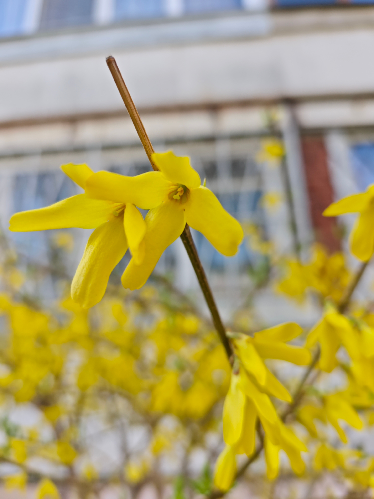 A close-up shot of bright yellow forsythia flowers in bloom against a blurry background. The flowers are clustered on a thin brown stem, and the backdrop features indistinct building elements includin…read more