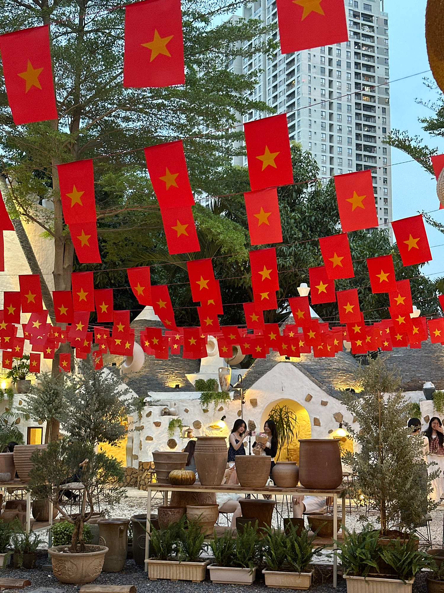 The image shows a street decorated with numerous red Vietnamese flags, each featuring a yellow star. These flags are strung overhead, creating a festive and patriotic atmosphere. In the background, a…read more