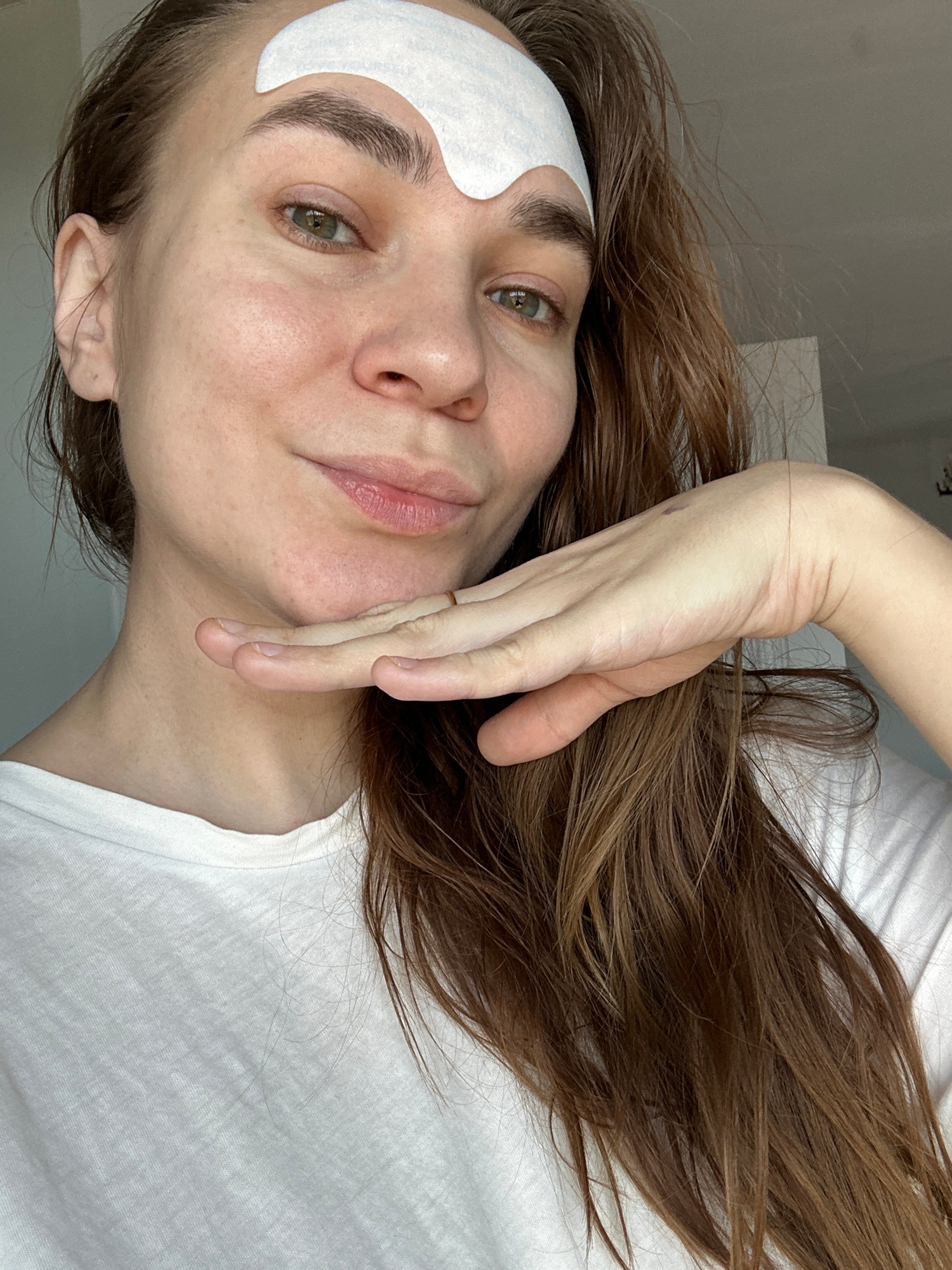 A woman with brown hair is looking at the camera. She is wearing a white t-shirt and has a white patch on her forehead. Her hand is resting on her chin. The background is out of focus. There is no inf…read more