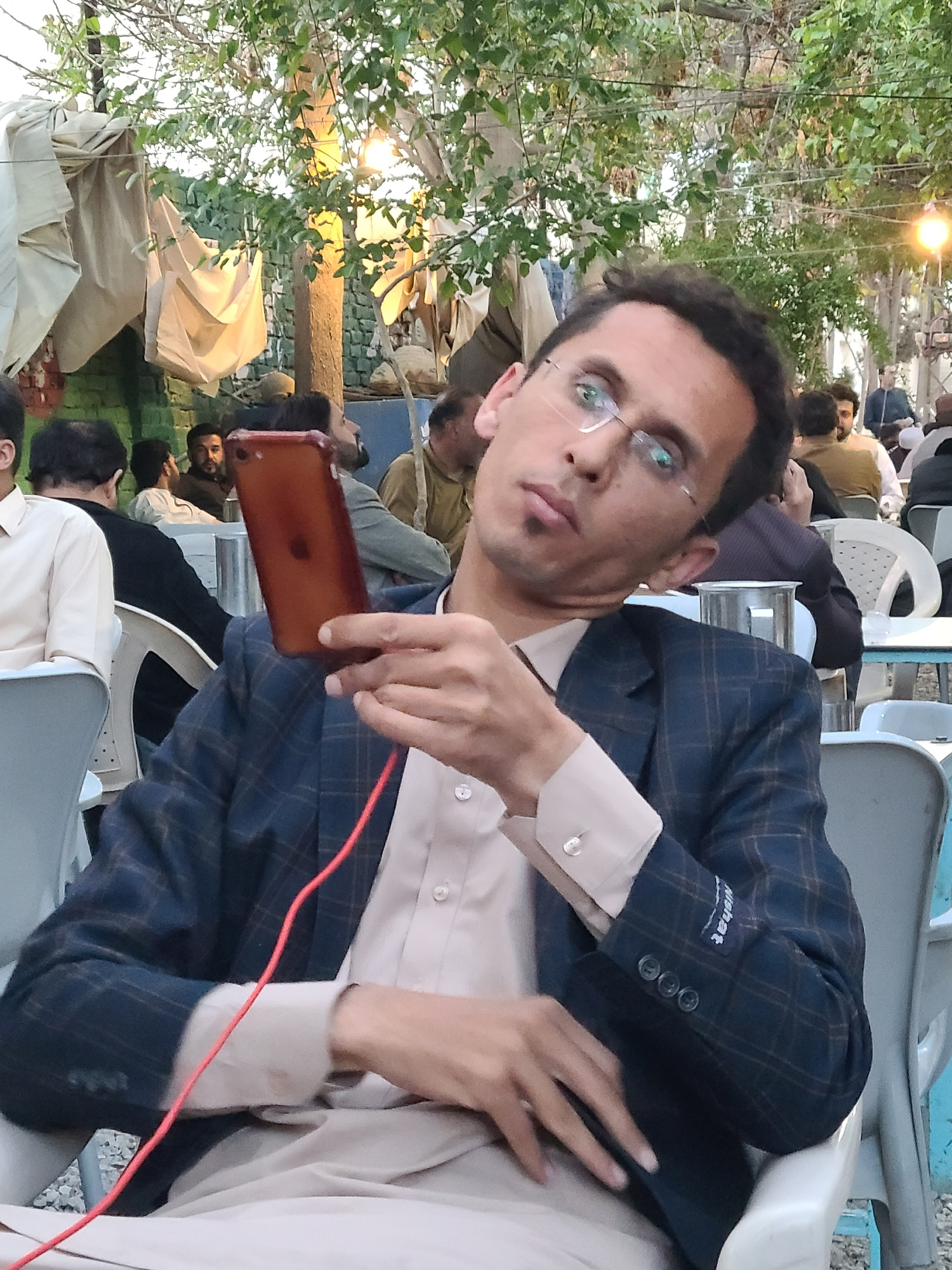 The image shows a man in a plaid blazer holding a mobile phone connected to a red charging cable. He is wearing glasses and a light-colored shirt. He is seated in a white plastic chair. The background includes other people, some sitting and some standing, suggesting a gathering or meeting. There are trees and foliage, along with some artificial lighting. The man's blazer has the name "Nishat" embroidered on the sleeve. Given the location information, the scene is likely outdoors in Quetta City Tehsil, Pakistan, potentially in a park or public area. | Open Wire