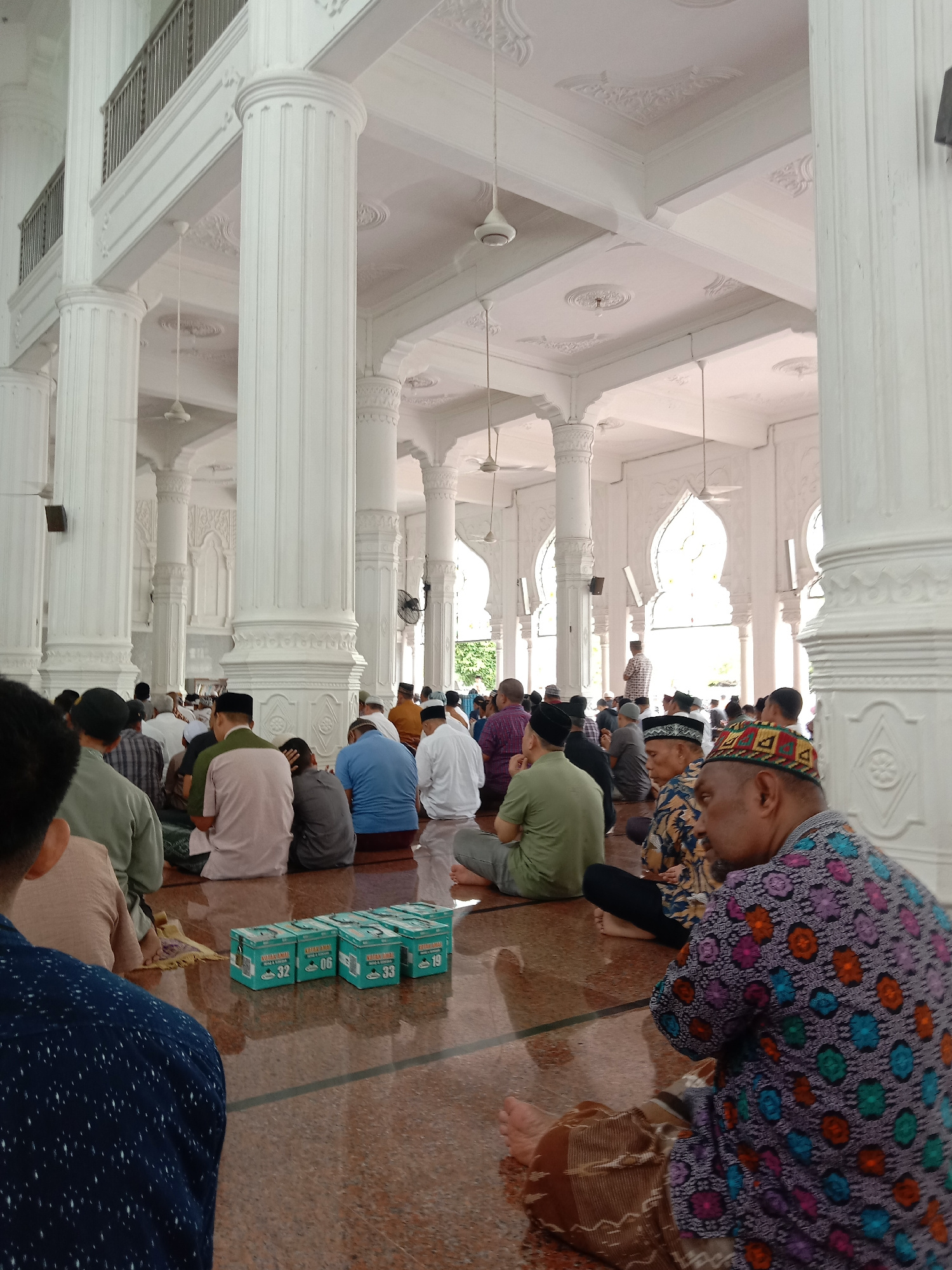 A wide-angle, medium shot shows the interior of a mosque in Lhokseumawe, Indonesia, with a group of Muslim men seated on the floor for prayers. The men, of varying ages, wear traditional clothing, inc…read more