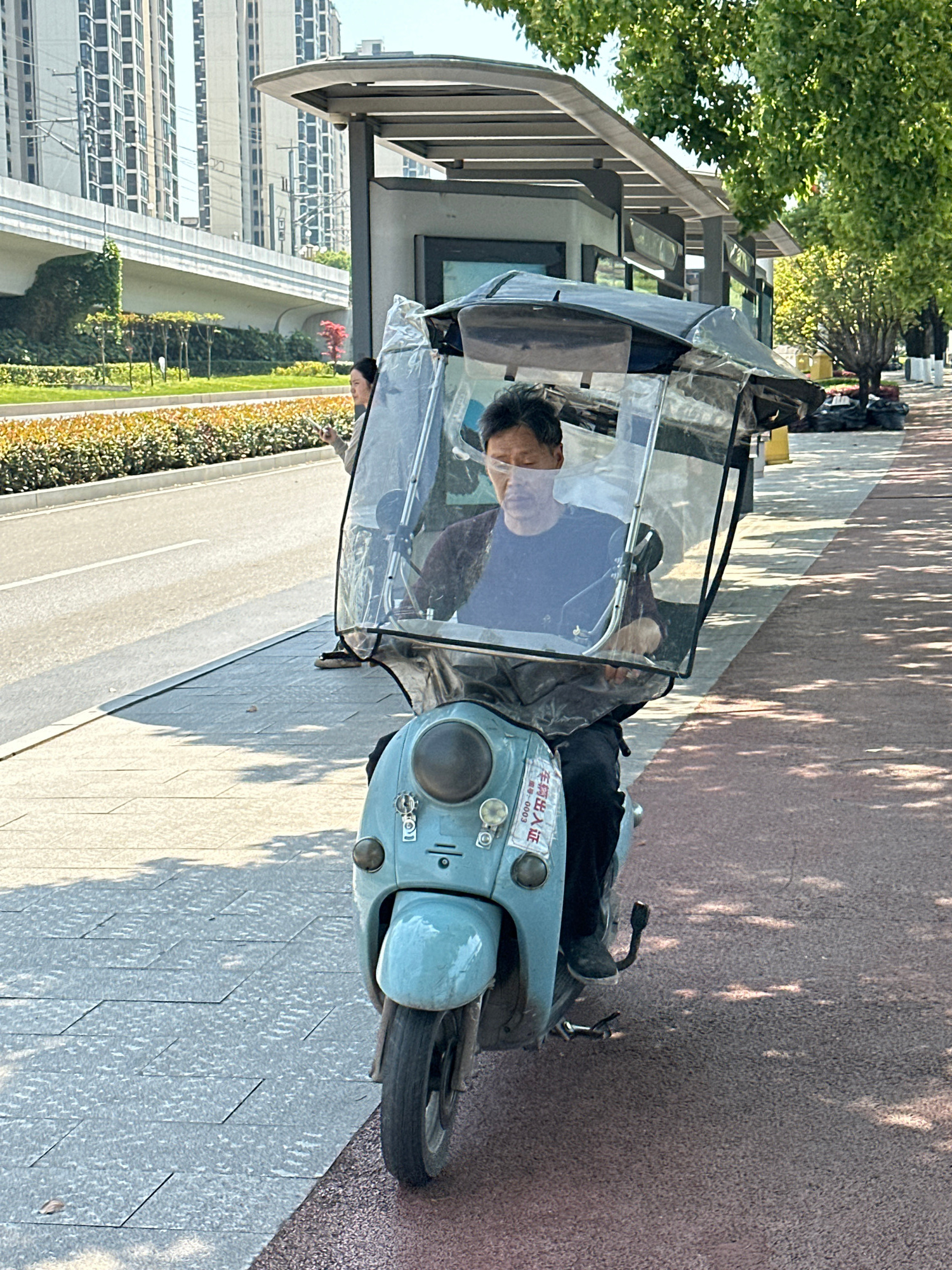 A man wearing a face mask is driving a light blue electric scooter with a transparent weather shield in Jiangjin, China. The scooter is parked on a sidewalk next to a street and a bus stop shelter. Inβ¦read more