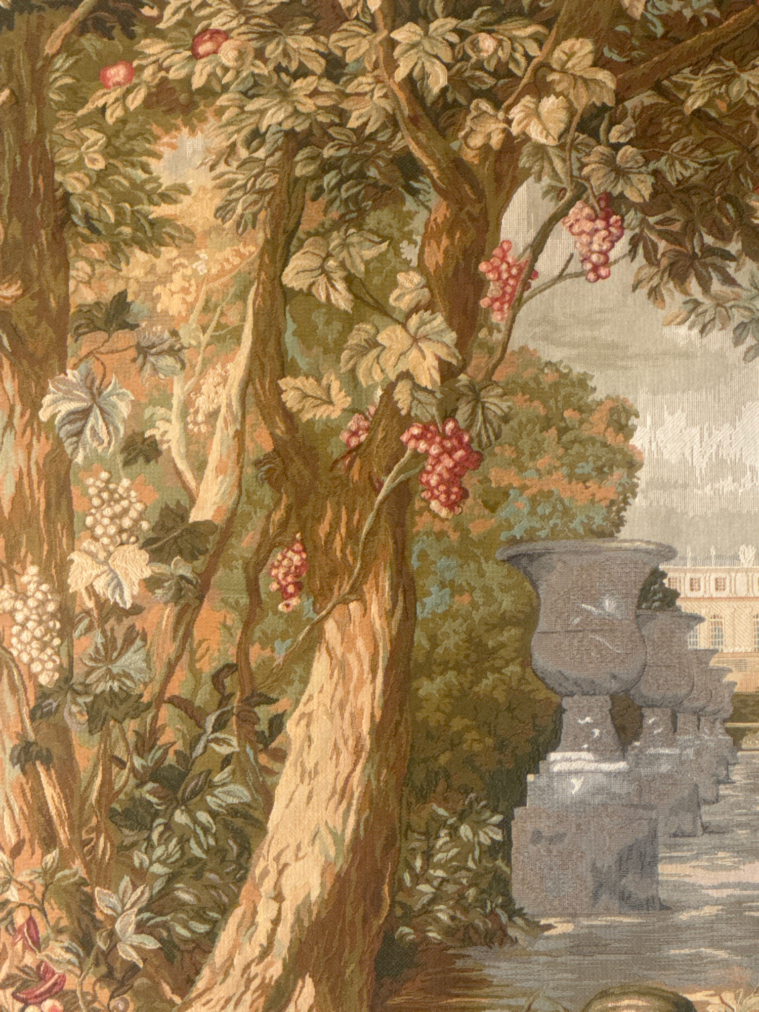 The image is a close-up section of a tapestry depicting a natural scene. The foreground is dominated by lush foliage, primarily vines with leaves and clusters of grapes or berries in varying shades of…read more