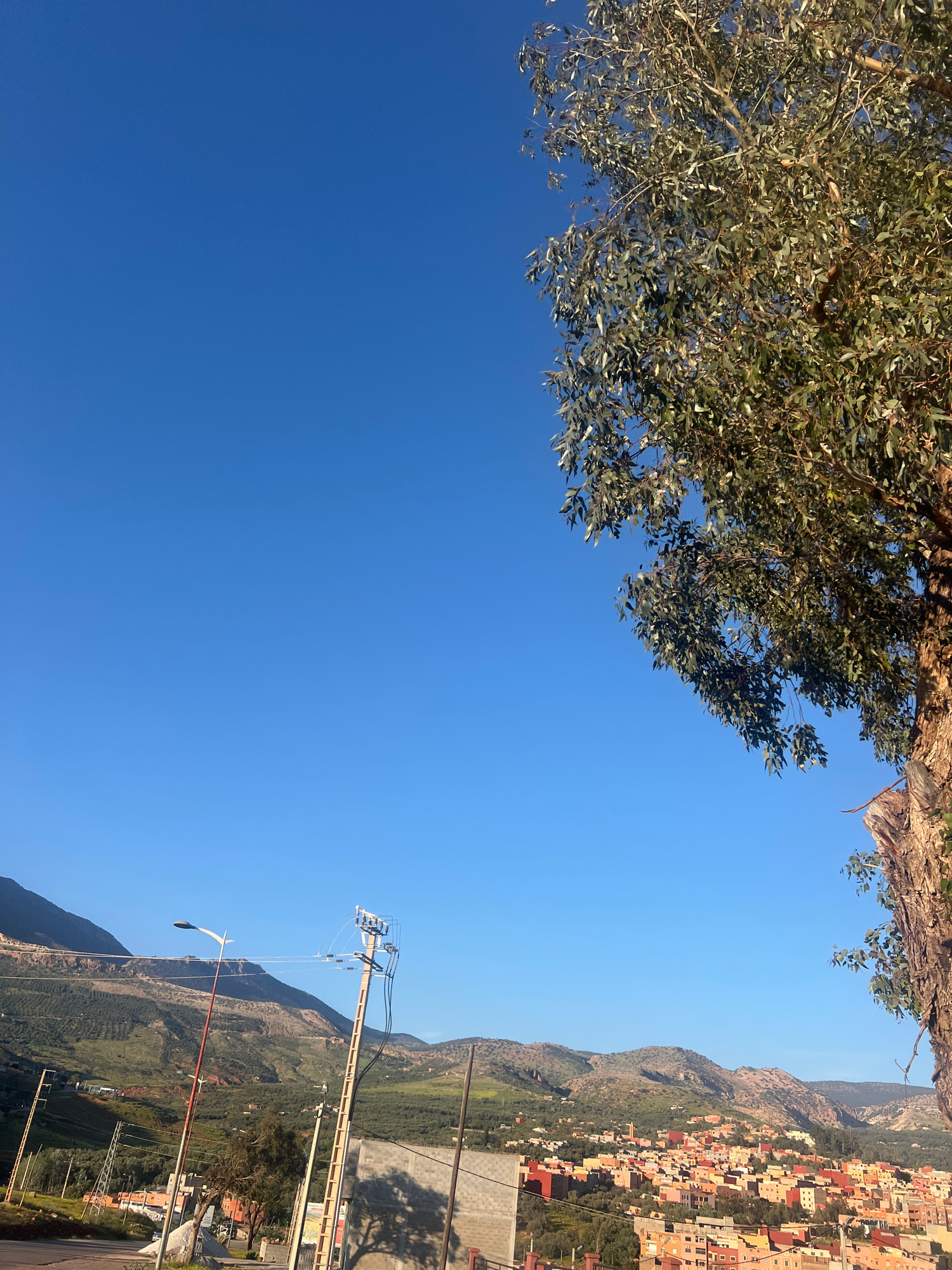 The image shows a view from the city of Ouaouizert, Morocco. In the upper left corner, there is a tree with green leaves. The sky is a clear blue. On the right side of the image, there are mountains a…read more