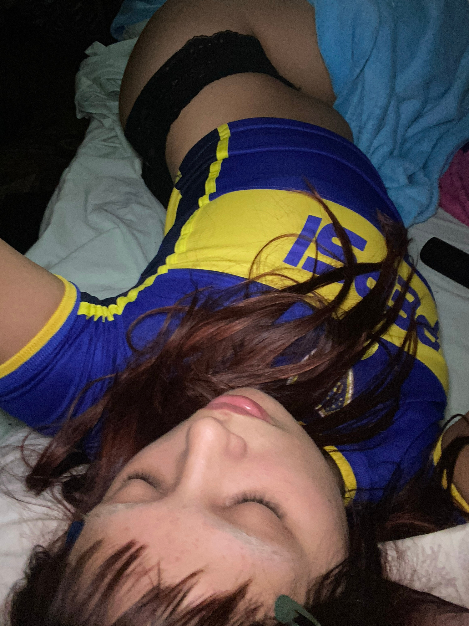 A young, light-skinned woman with auburn hair is lying in bed. She is wearing a yellow and blue Boca Juniors football jersey and black lace underwear. The Boca Juniors soccer team is based in the La B…read more