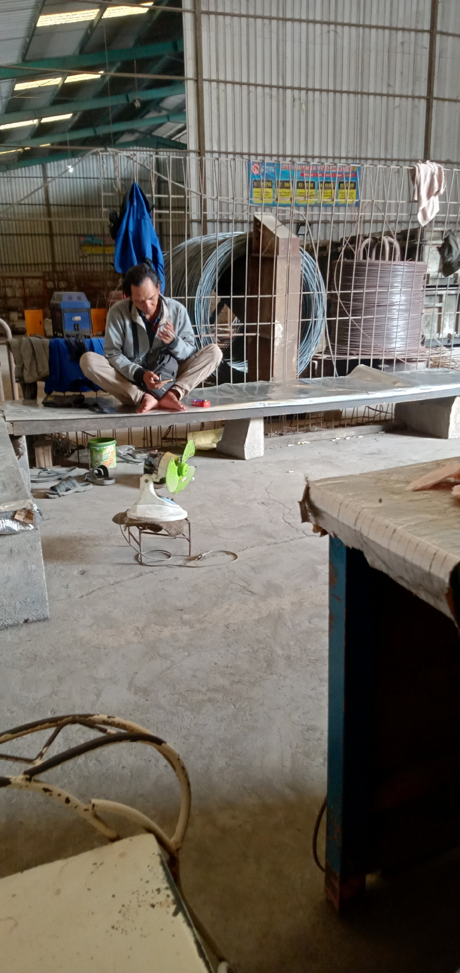 A man sits cross-legged on a long, low bench inside a building in Banjaran, Indonesia. He wears a gray jacket, light-colored pants, and has a dark bag slung across his body. He is looking down at his…read more