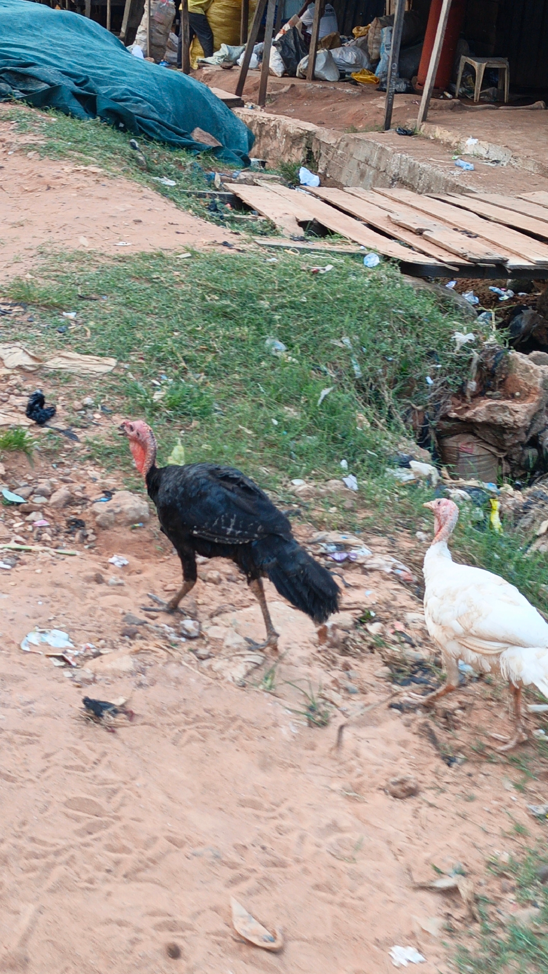 The image depicts an outdoor scene, likely a semi-urban or market area, characterized by a dirt path and makeshift structures. **Subjects:** The primary subjects are two turkeys: one with black feath…read more