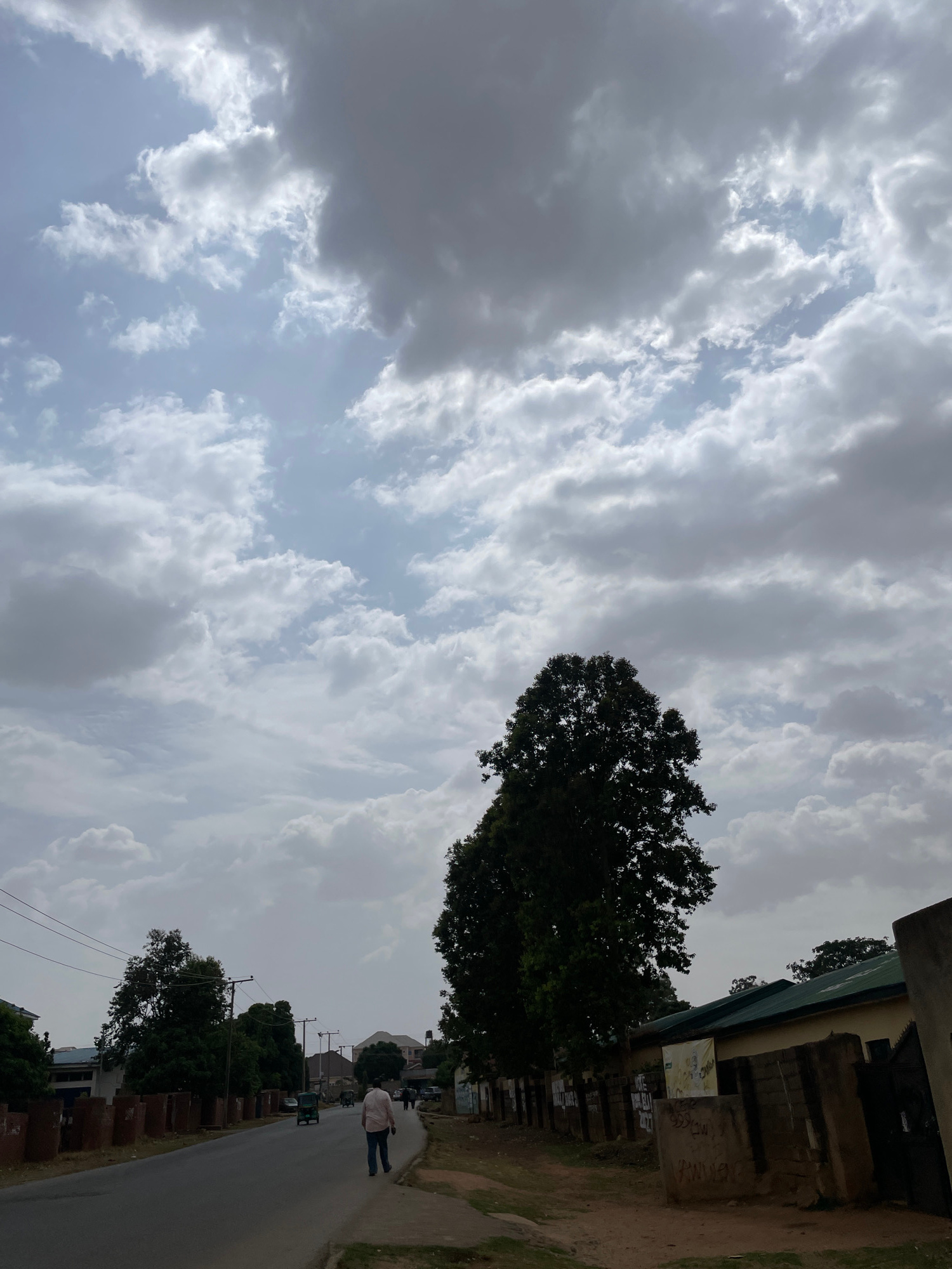 The image captures a street scene in Jos, Nigeria, under a sky filled with dramatic clouds. A large tree dominates the upper-right, while additional trees line the street. A single person walks along…read more
