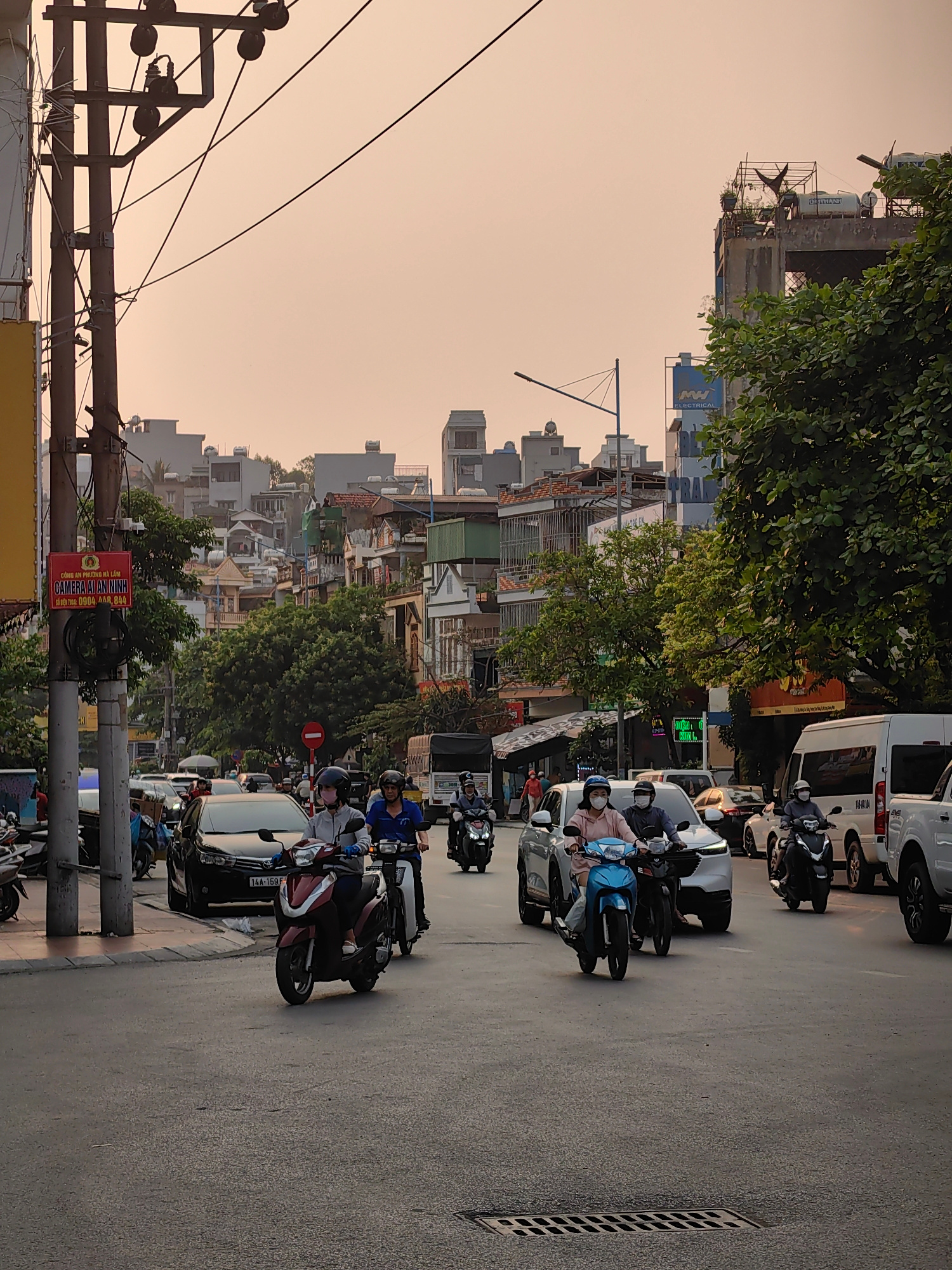 The image shows a street scene in Ha Lam Ward, Vietnam, with moderate traffic composed of cars and motorbikes. Several people are riding motorbikes and wearing masks. There are buildings and trees lin…read more