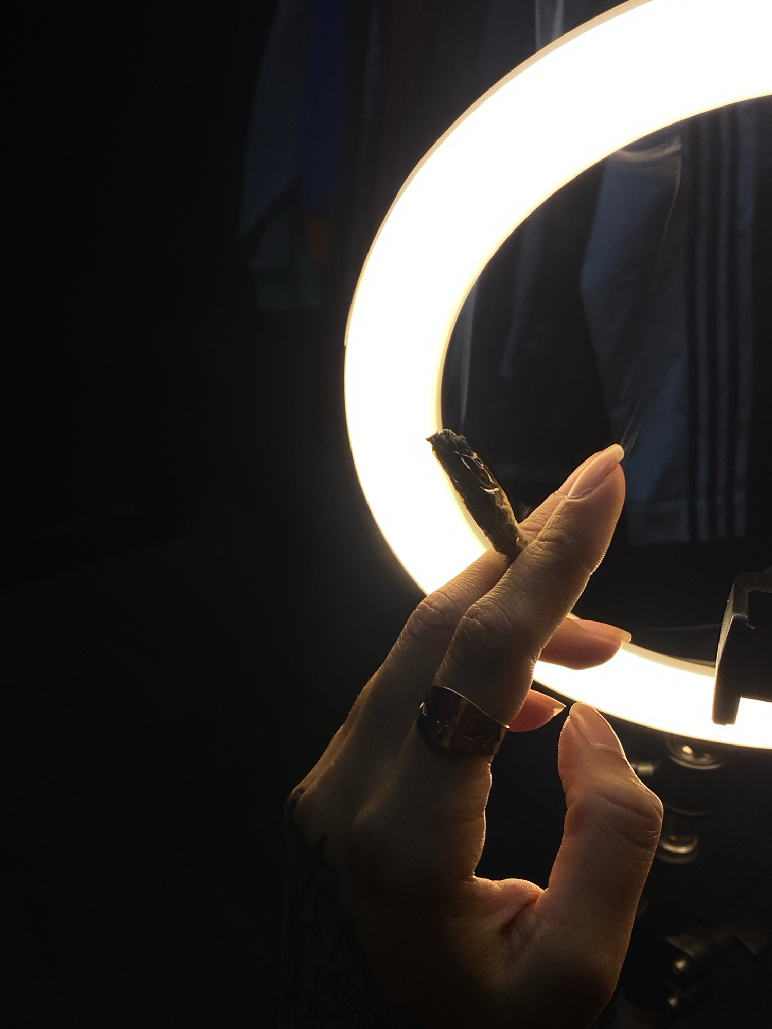 A close-up shot focuses on a person's hand holding a partially smoked, dark-colored cigarette or joint. The hand has a gold ring on one of the fingers and a tattoo visible on the wrist. The background…read more