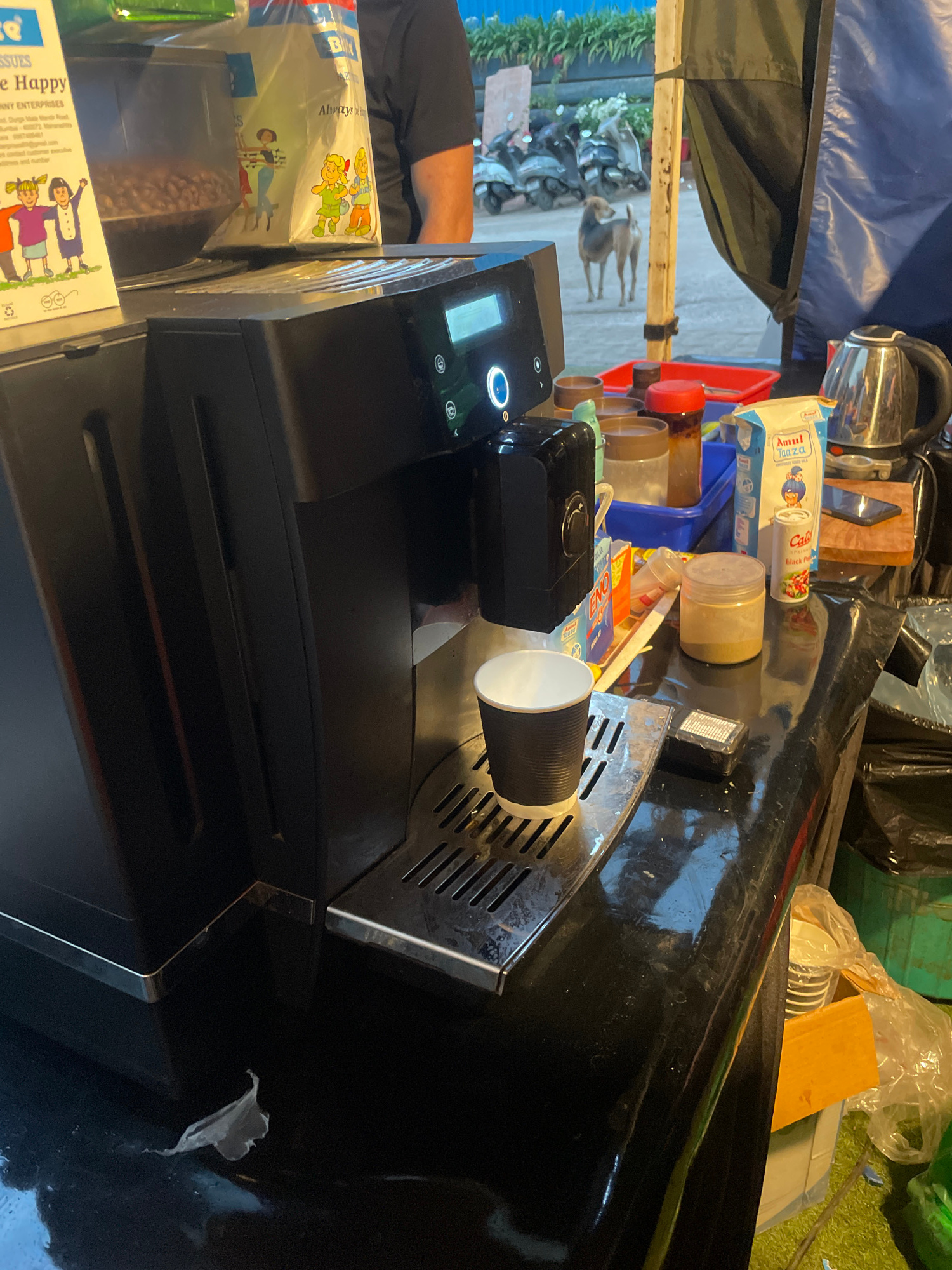 The image depicts a black coffee machine in a cluttered outdoor setting. A cup sits on the machine's dispensing platform. Behind the machine, there are various food and beverage items, including a carβ¦read more