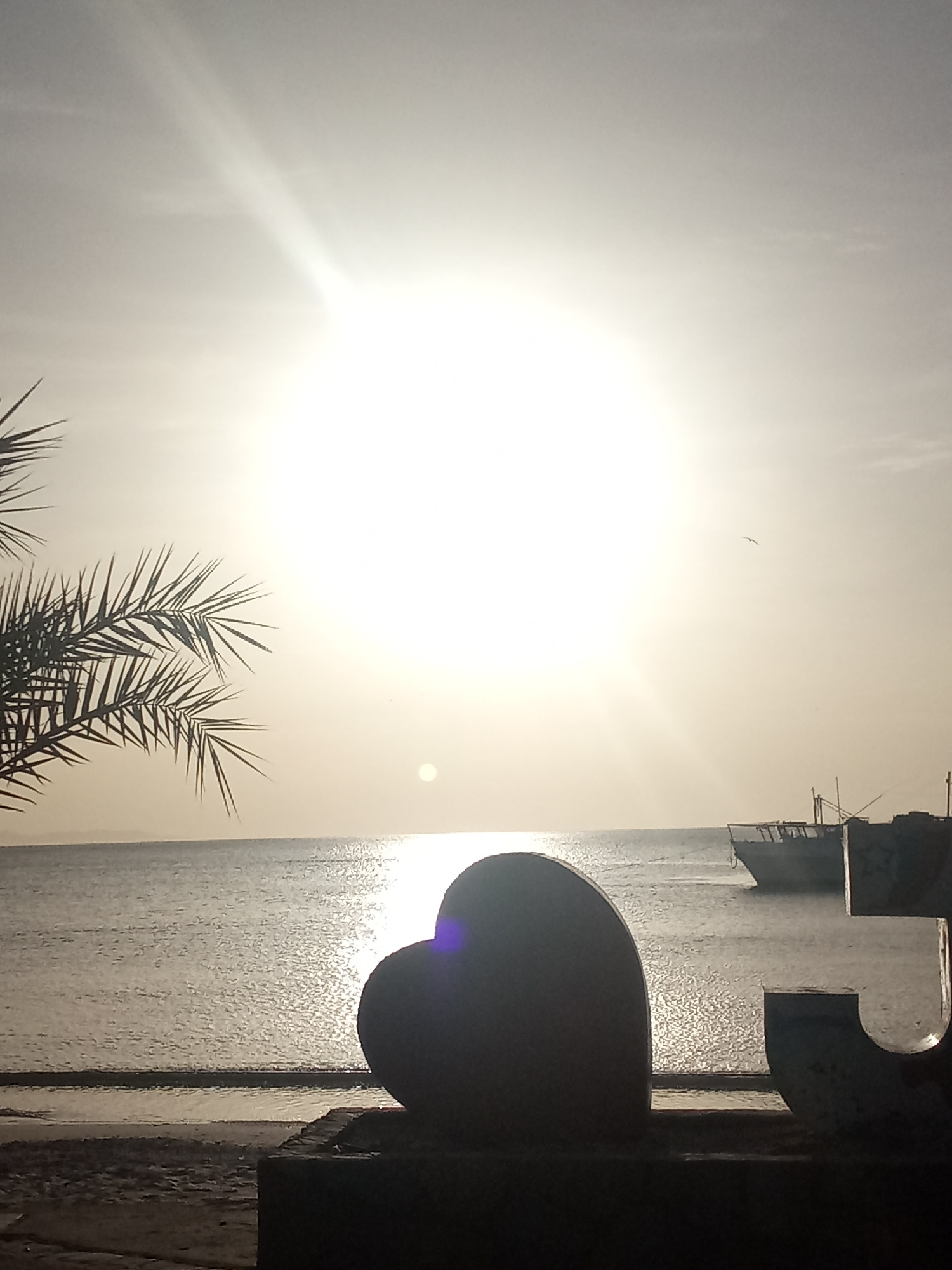 Here is a description of the image: The image captures a seaside view in Juan Griego, Venezuela at what appears to be sunrise or sunset. The sun is a bright focal point in the sky, casting a strong g…read more