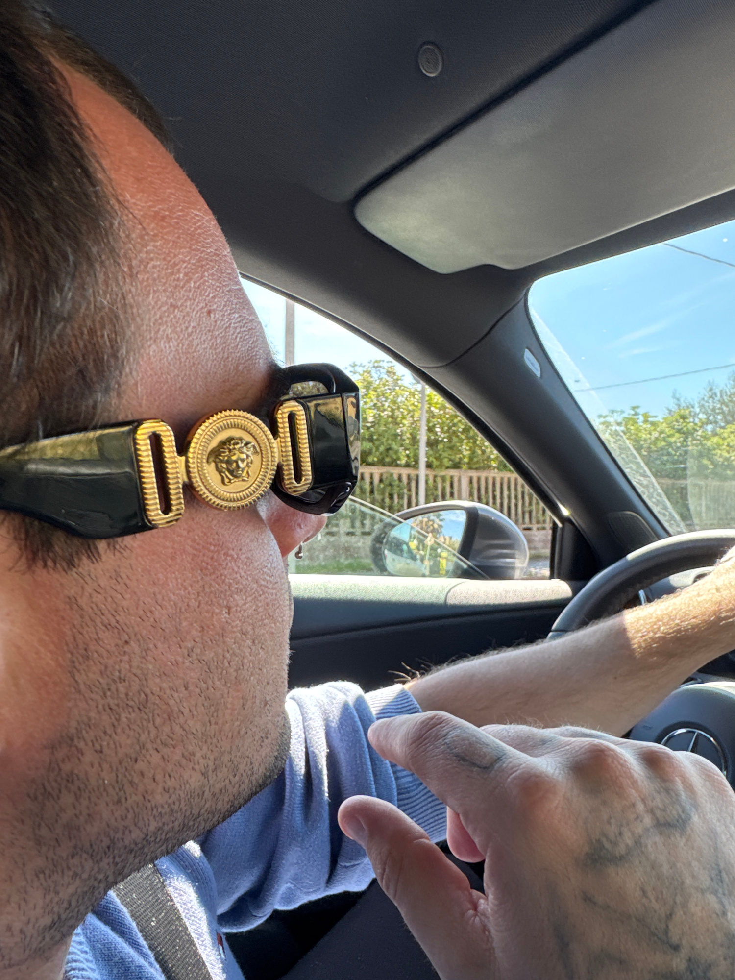 A man is positioned in the driver's seat of a car, wearing a black and gold Versace belt around his neck. The car's interior is visible, including the steering wheel, a side mirror, and a sun visor. S…read more