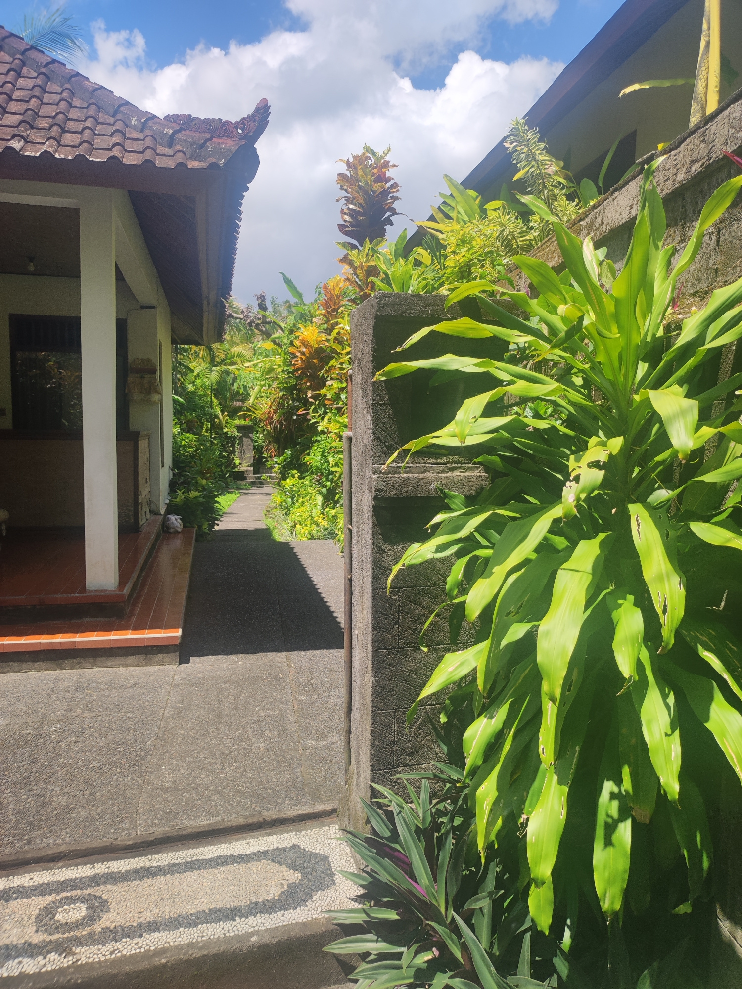 The image depicts a pathway in Ubud, Indonesia, framed by lush tropical vegetation. The pathway leads towards a receding background of greenery under a bright sky with scattered clouds. To the left stβ¦read more