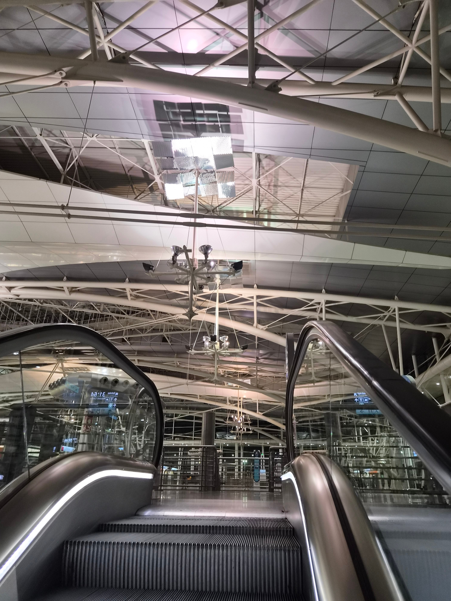 The image depicts the interior of Francisco Sá Carneiro Airport in Moreira, Portugal. Focus is on the architectural elements of the building and an escalator. The construction consists of white, steel…read more
