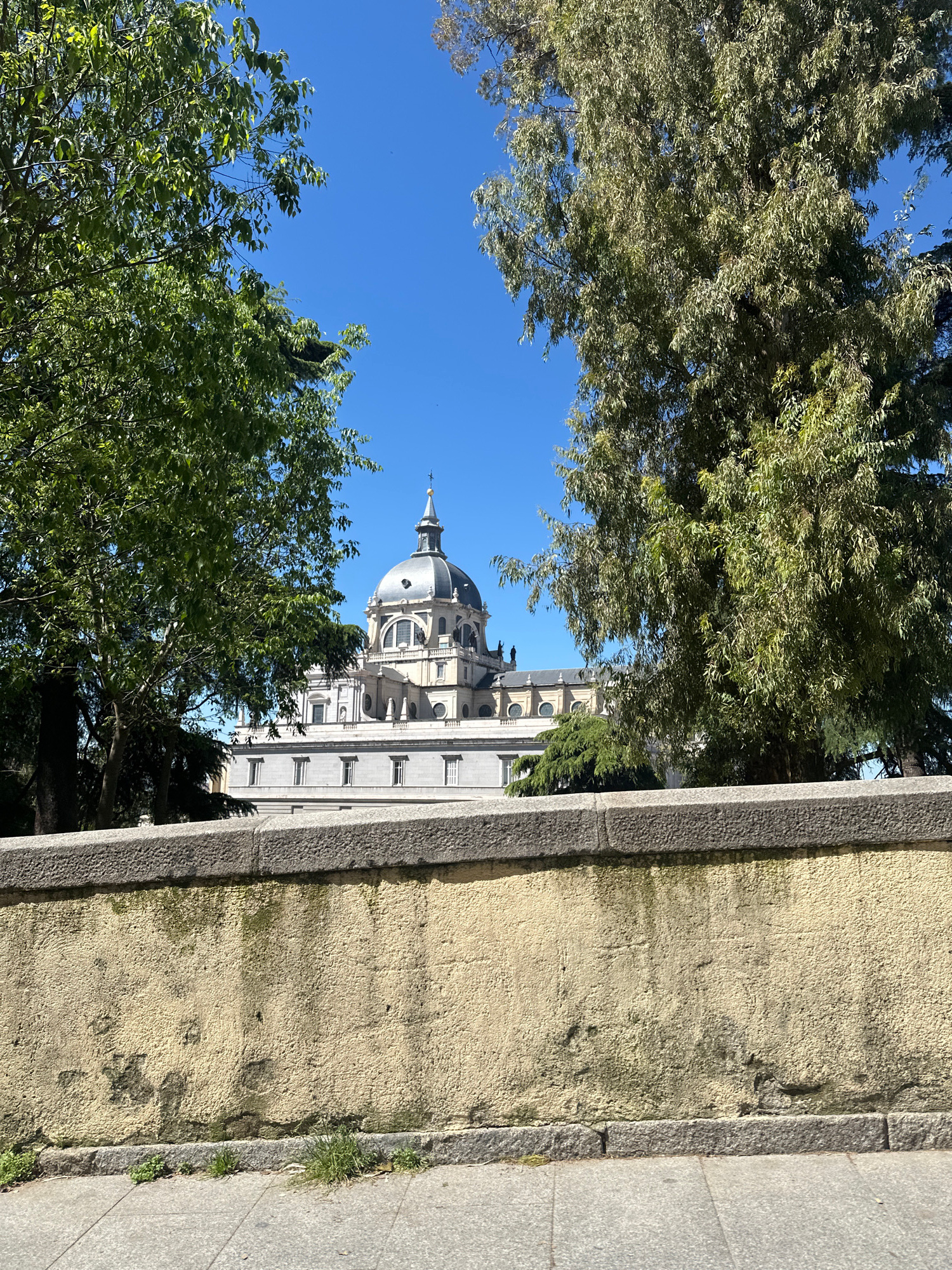 The image captures a vibrant, sunlit view of a grand architectural structure, likely the Almudena Cathedral in Madrid, Spain, partially framed by lush green trees. The cathedral, situated towards the…read more
