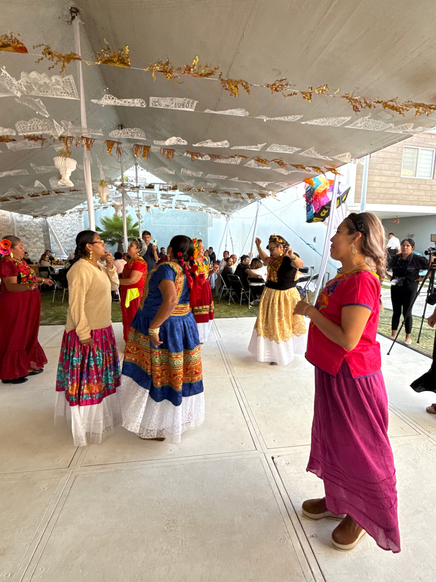 The scene depicts a group of women performing a traditional Mexican dance in an outdoor setting, likely in Puebla, Mexico. Five women are visible in the foreground, each wearing different colored trad…read more