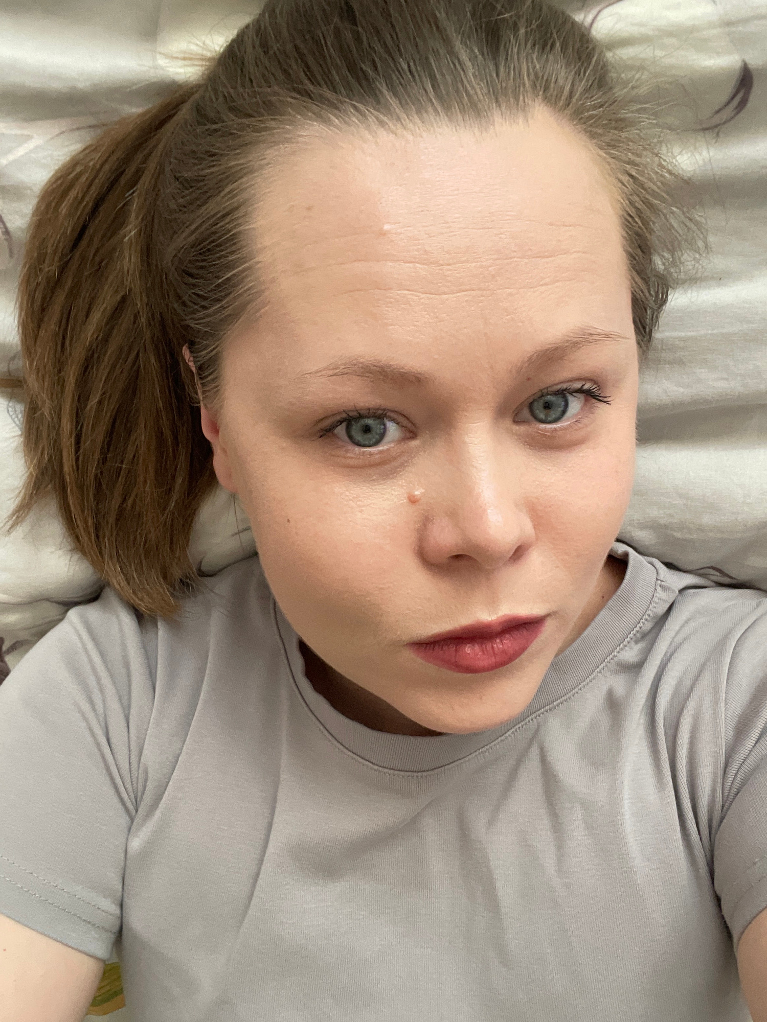 This is a close-up, slightly overhead portrait of a young woman lying on her back, looking directly at the camera. Her head is tilted to her left, with her light brown hair spread around her. The sub…read more