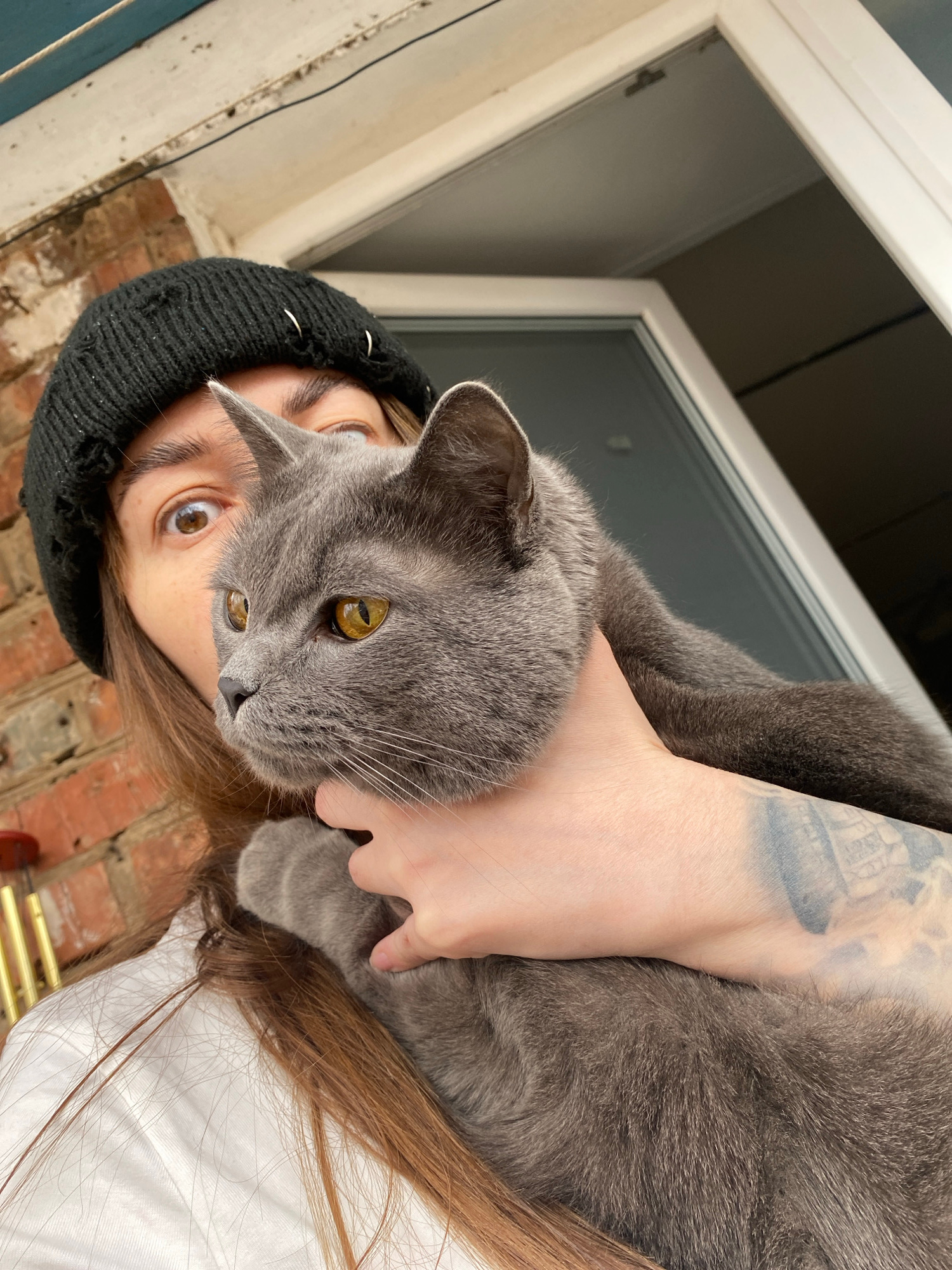 A person wearing a black beanie is holding a gray cat. The person is wearing a white shirt and has brown hair. Their arm has a tattoo. They appear to be standing by a window and a brick wall outside.…read more