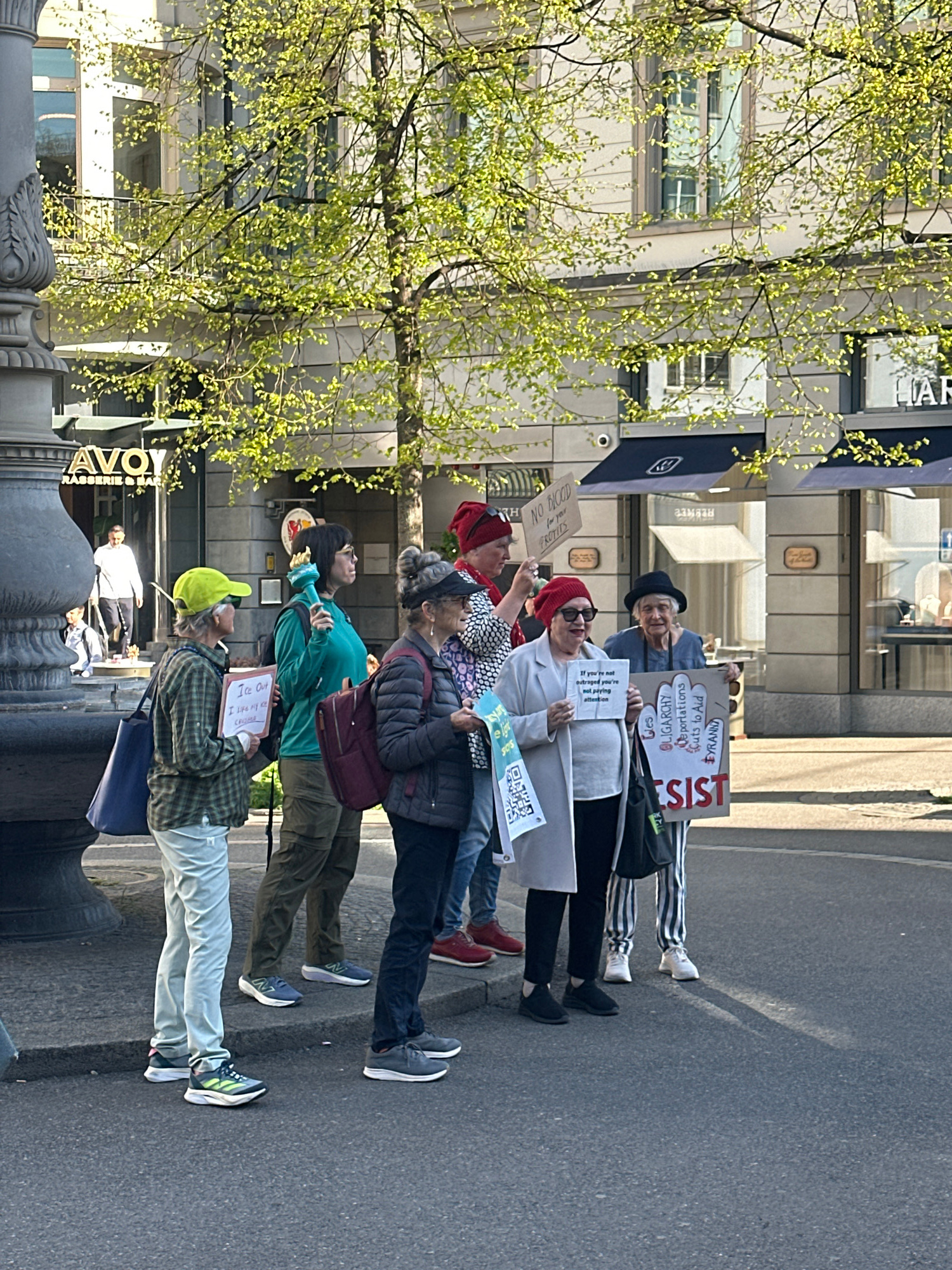 A group of protesters stand on a sidewalk in front of the "AVOY RASSERIE & BAR" restaurant and "HAFNER" building in Zurich, Switzerland. The protesters hold various signs with slogans about oligarchy,…read more