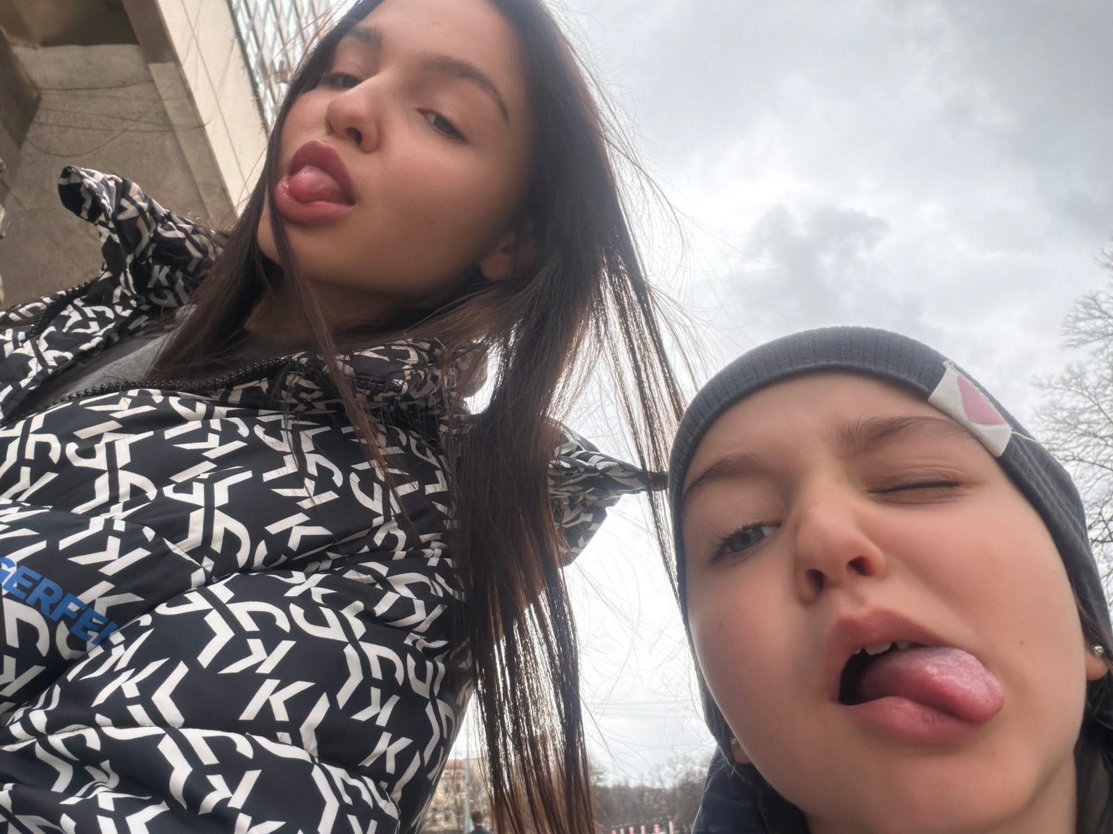 Two individuals are visible in the image, one is wearing a grey beanie with a pink and white design and the other wearing a black and white patterned puffer jacket with “KARL LAGERFELD” printed on it.…read more
