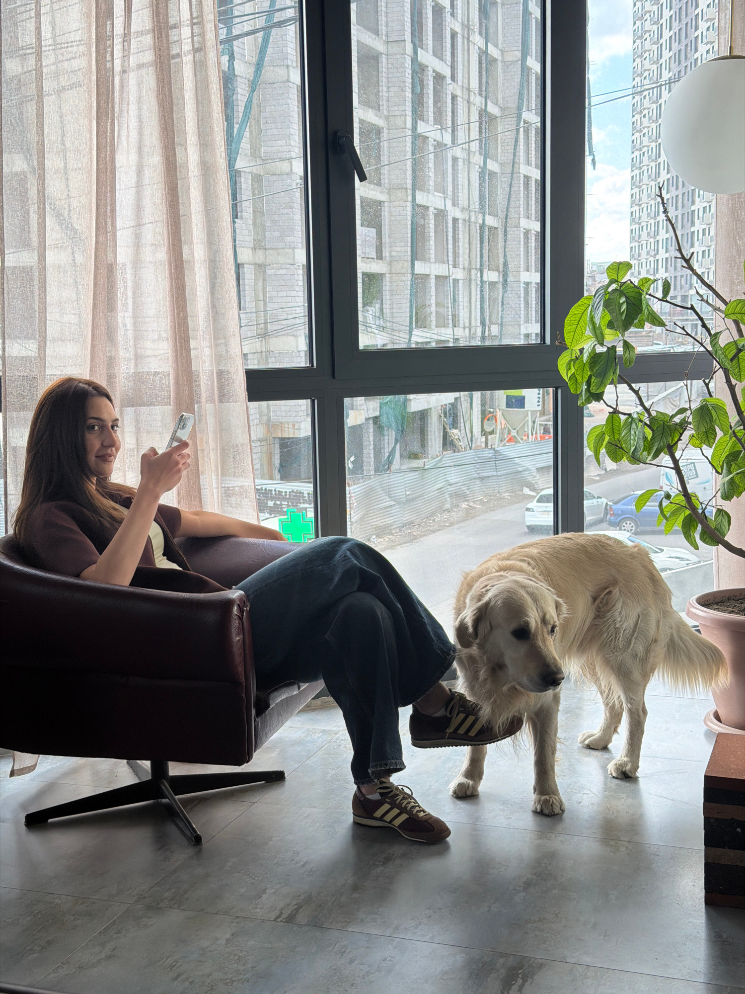 A woman with long brown hair sits in a dark brown armchair, looking at a smartphone in her hands. She wears a brown top and dark blue jeans, with Adidas sneakers on her feet. A golden retriever stands…read more