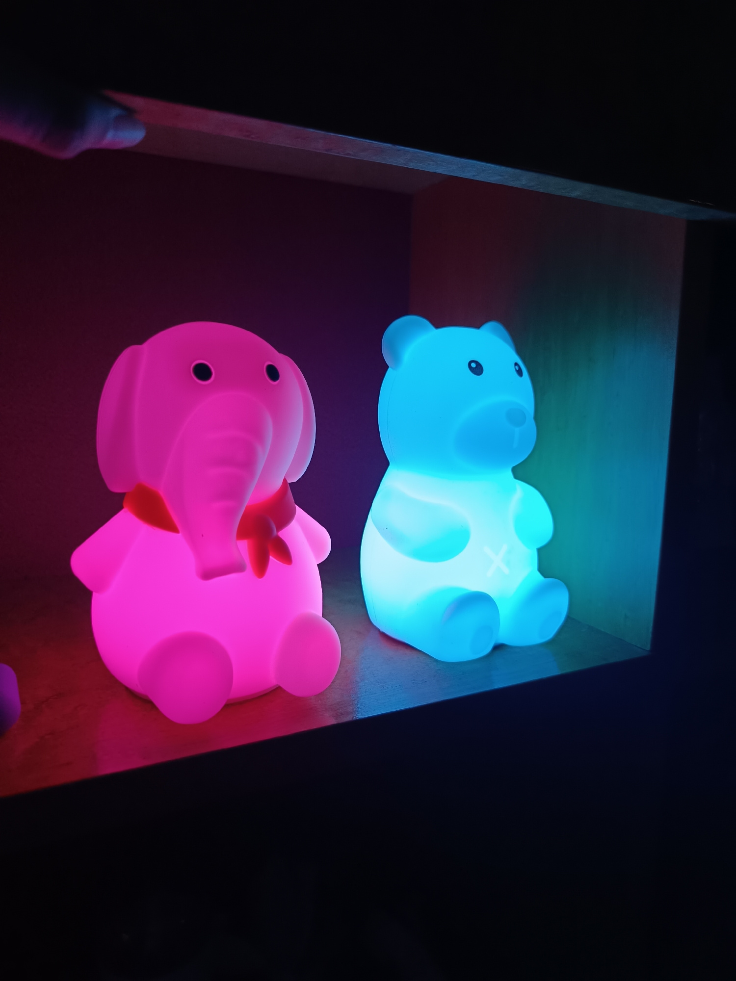 Two illuminated, animal-shaped night lights sit on a shelf within a dark, enclosed space. The left figure is an elephant, lit in bright pink, with a red ribbon around its neck. The right figure is a t…read more