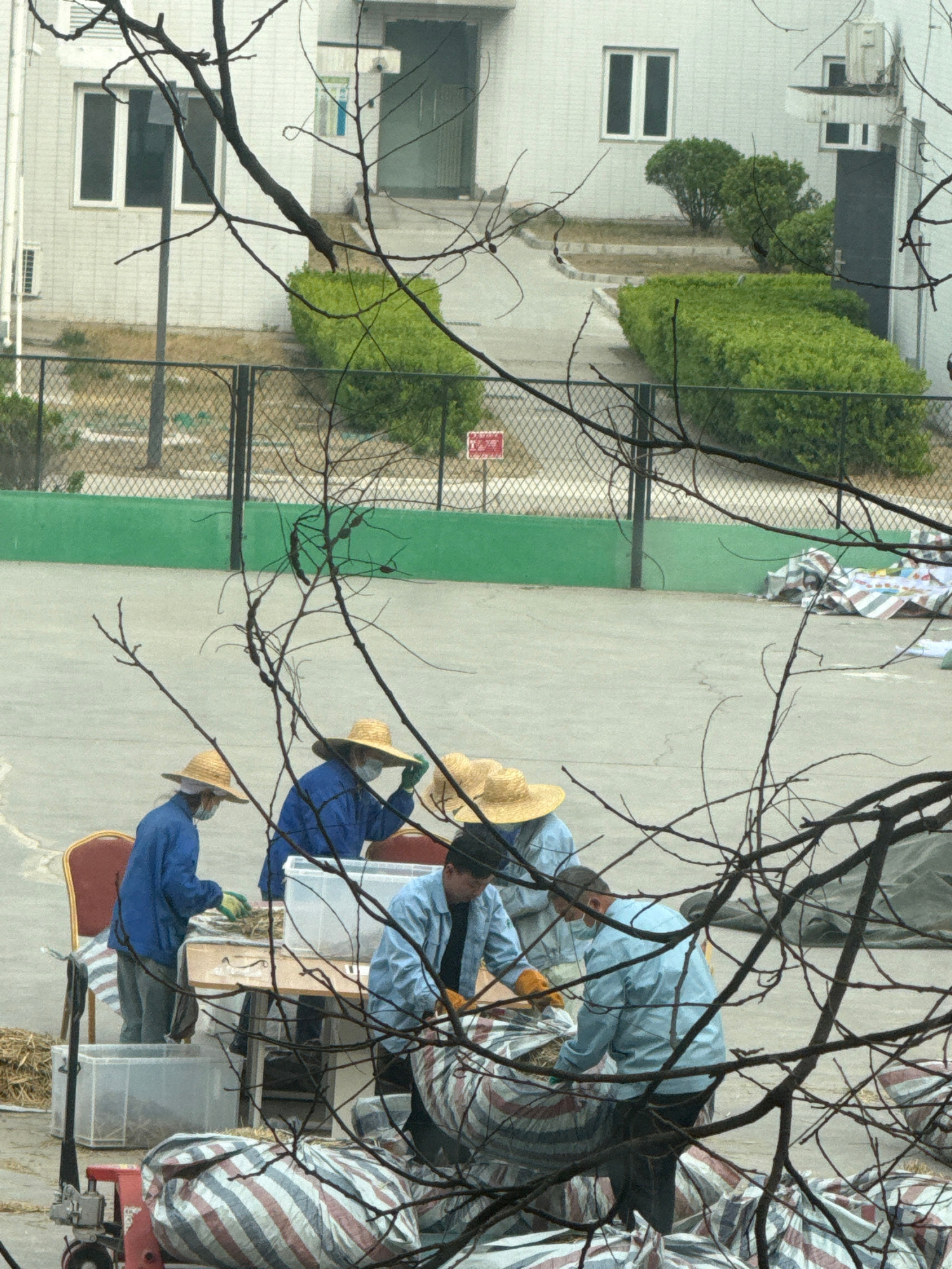 The image, taken in Daxing District, China, shows three individuals outdoors. They are wearing blue work suits and straw hats, and are likely engaged in some type of work activity at a table. The fore…read more