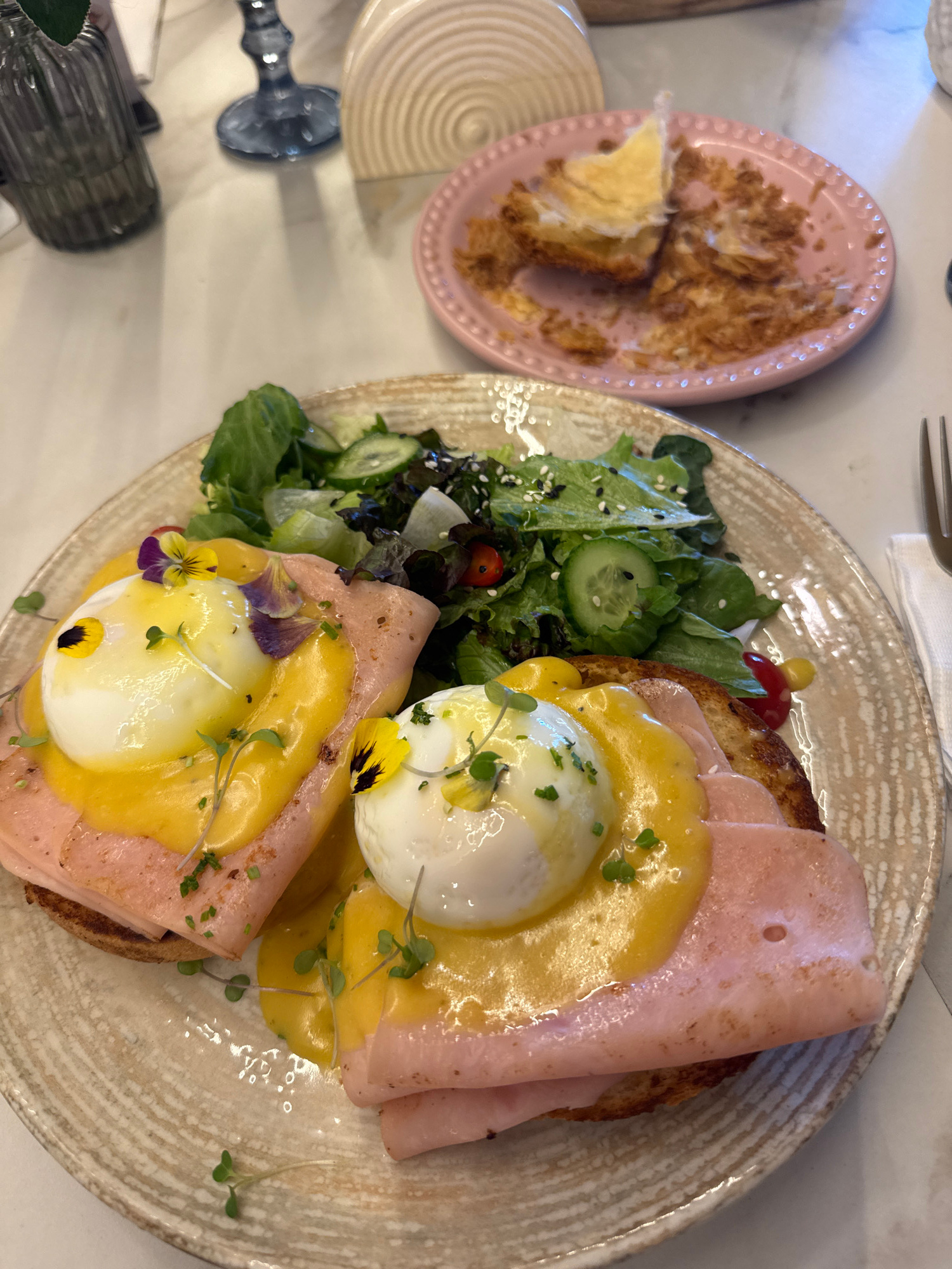 The image captures a table setting with a plate of Eggs Benedict, a side salad, and a dessert on a separate pink plate. The Eggs Benedict consists of two toast slices topped with ham, poached eggs, an…read more