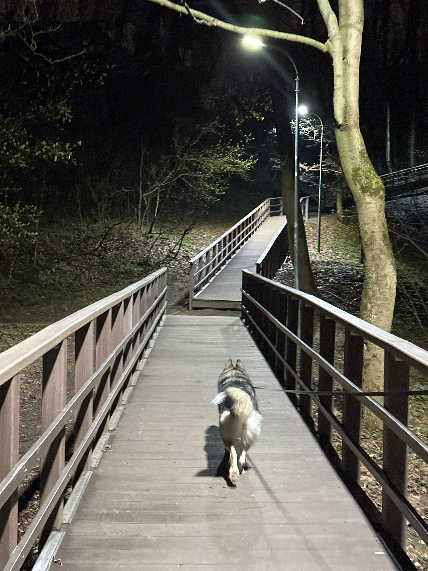 The image depicts a nocturnal scene on an elevated wooden walkway in what appears to be a park or wooded area in Moscow, Russia. The primary subject is a medium-sized dog, possibly a husky or similar…read more