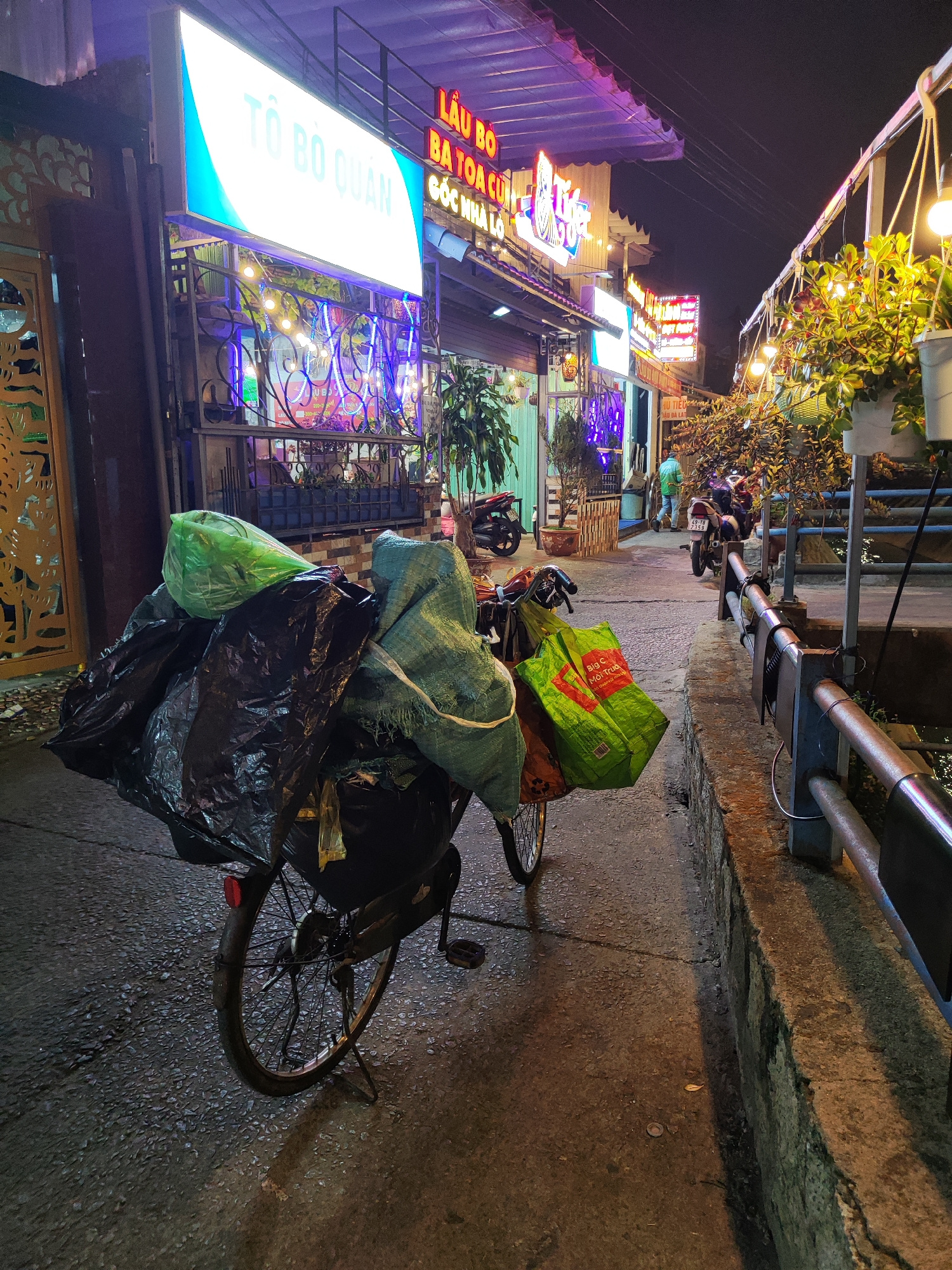 A bicycle overflowing with bags, likely used for transporting items, stands on a street in Cam Ly - Đà Lạt, Vietnam, at night. The bicycle is positioned on a narrow sidewalk next to a low concrete wal…read more