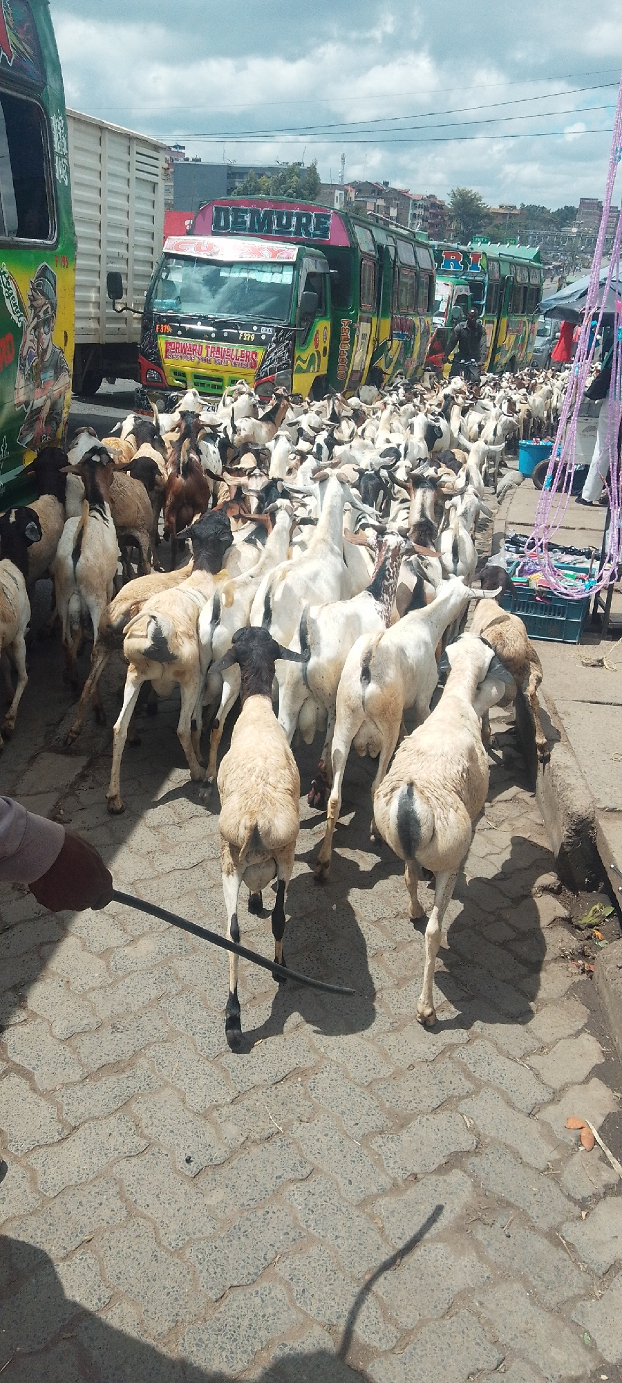 The image depicts a large herd of goats being moved down a paved street in Nairobi, Kenya. Several colorful matatus (Kenyan minibuses) are parked along the side of the road, their vibrant decorations…read more